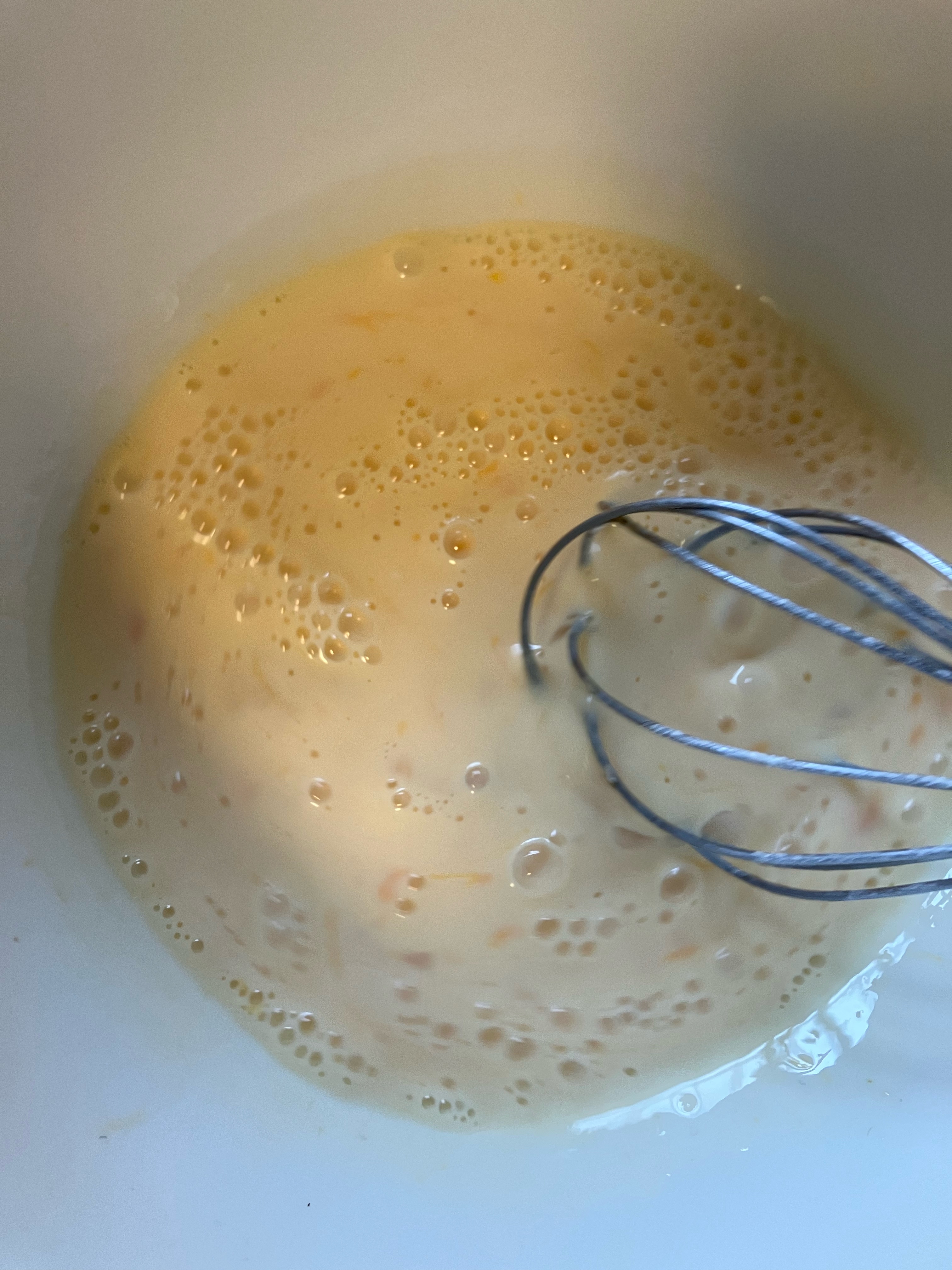ボウルを2つ用意し、1つは小麦粉をふるい入れ、もう1つは牛乳と卵を入れよく混ぜる。