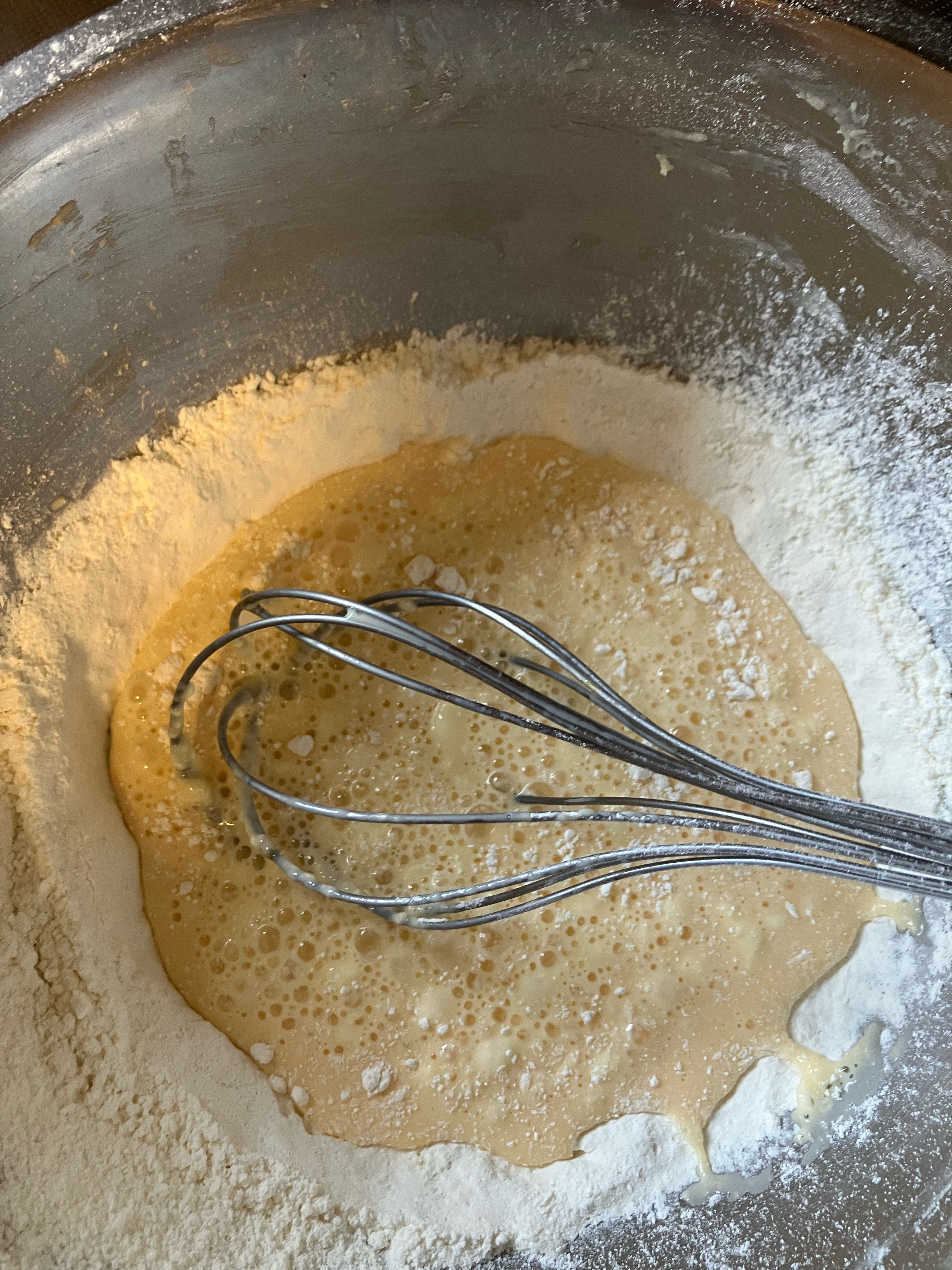 小麦粉の真ん中をあけ、牛乳と卵を混ぜたものを加え小麦粉を混ぜ合わせていく。