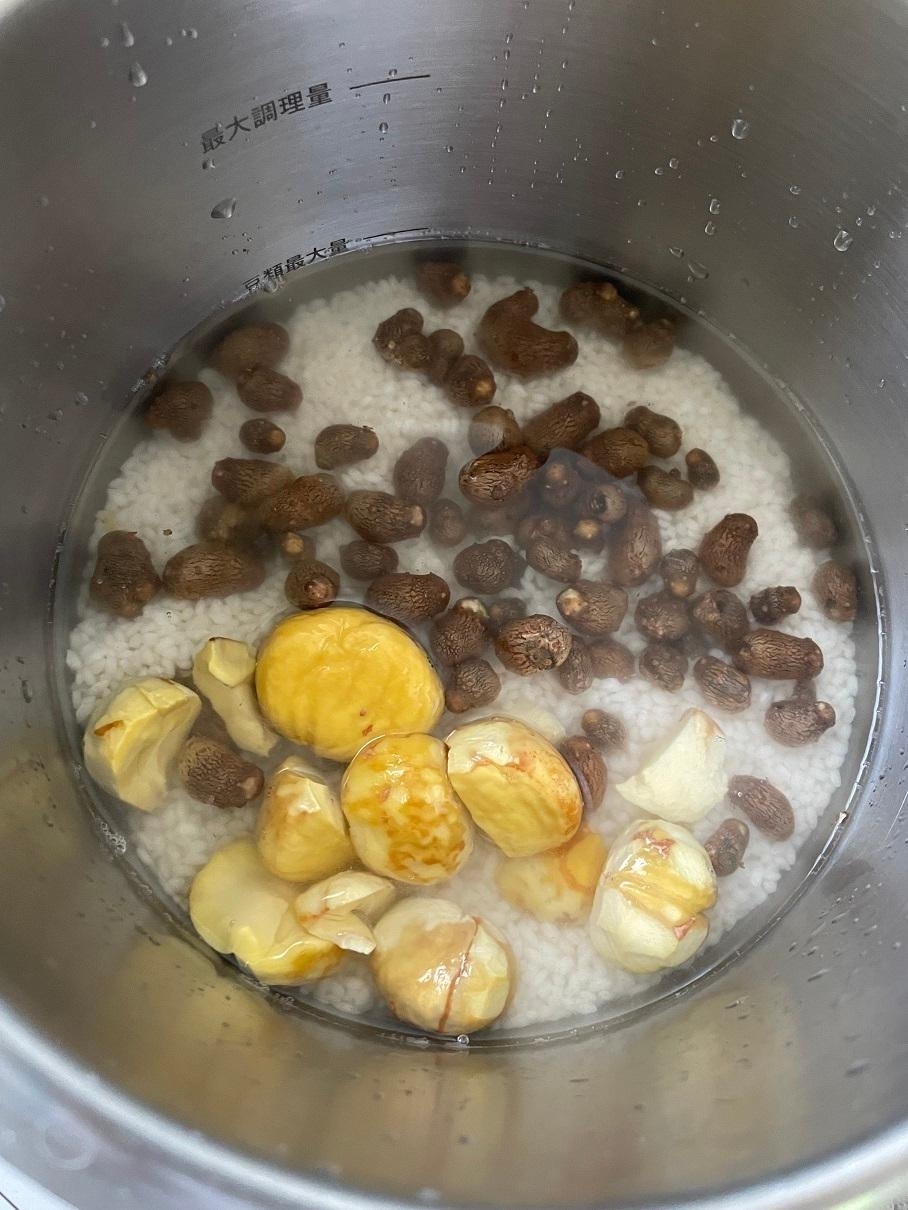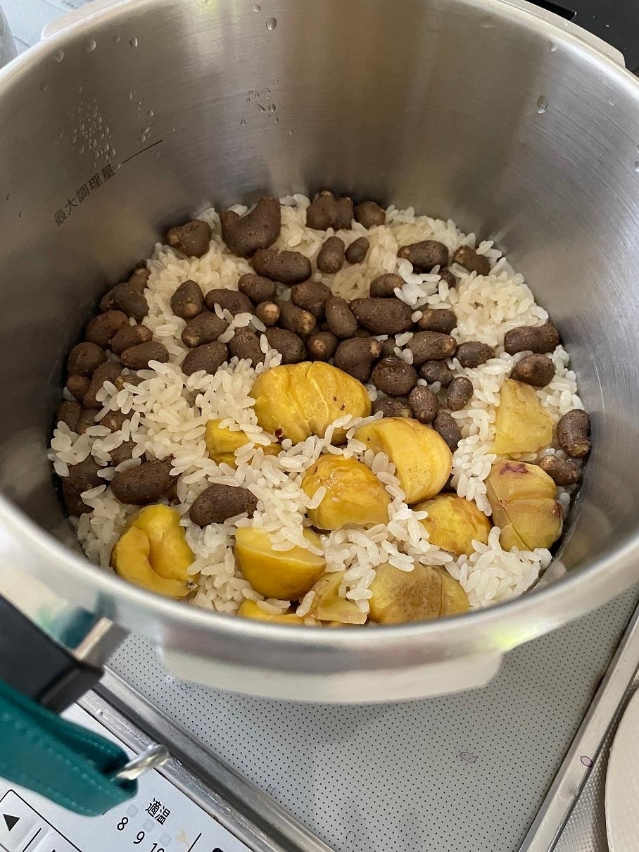 圧力鍋に米・水・白だしを入れ 上にむかご・栗をのせる。