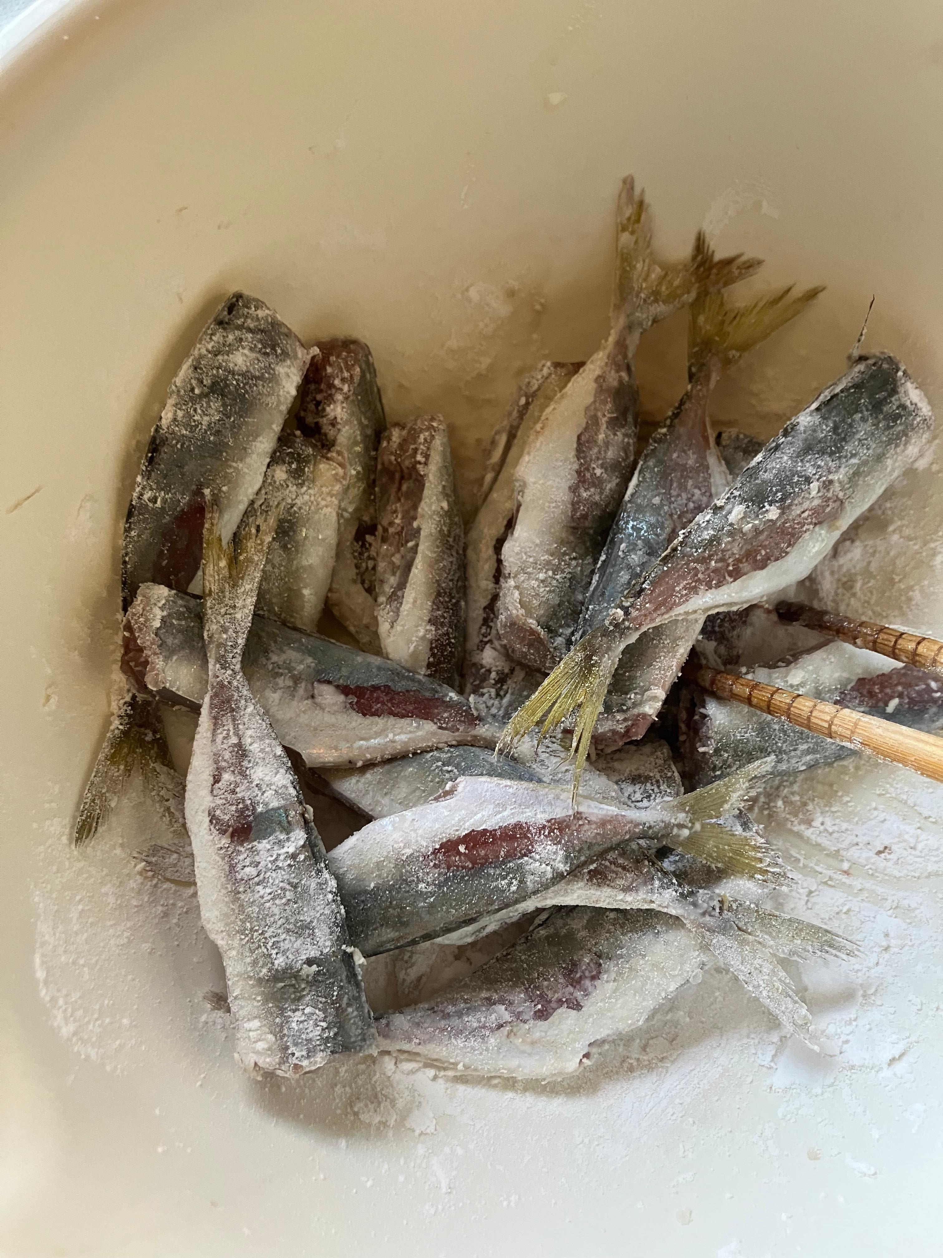 - 5 油を160度に熱し、鯵を6〜7分揚げる。油を切り、③に漬ける。