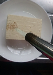水切りした木綿豆腐を皿に並べバーナーで好みの焼き色になるまで焼きます