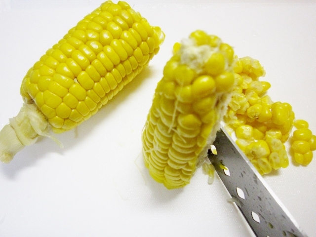 切った面を下にして立て、包丁でそぐように切って粒を取る。