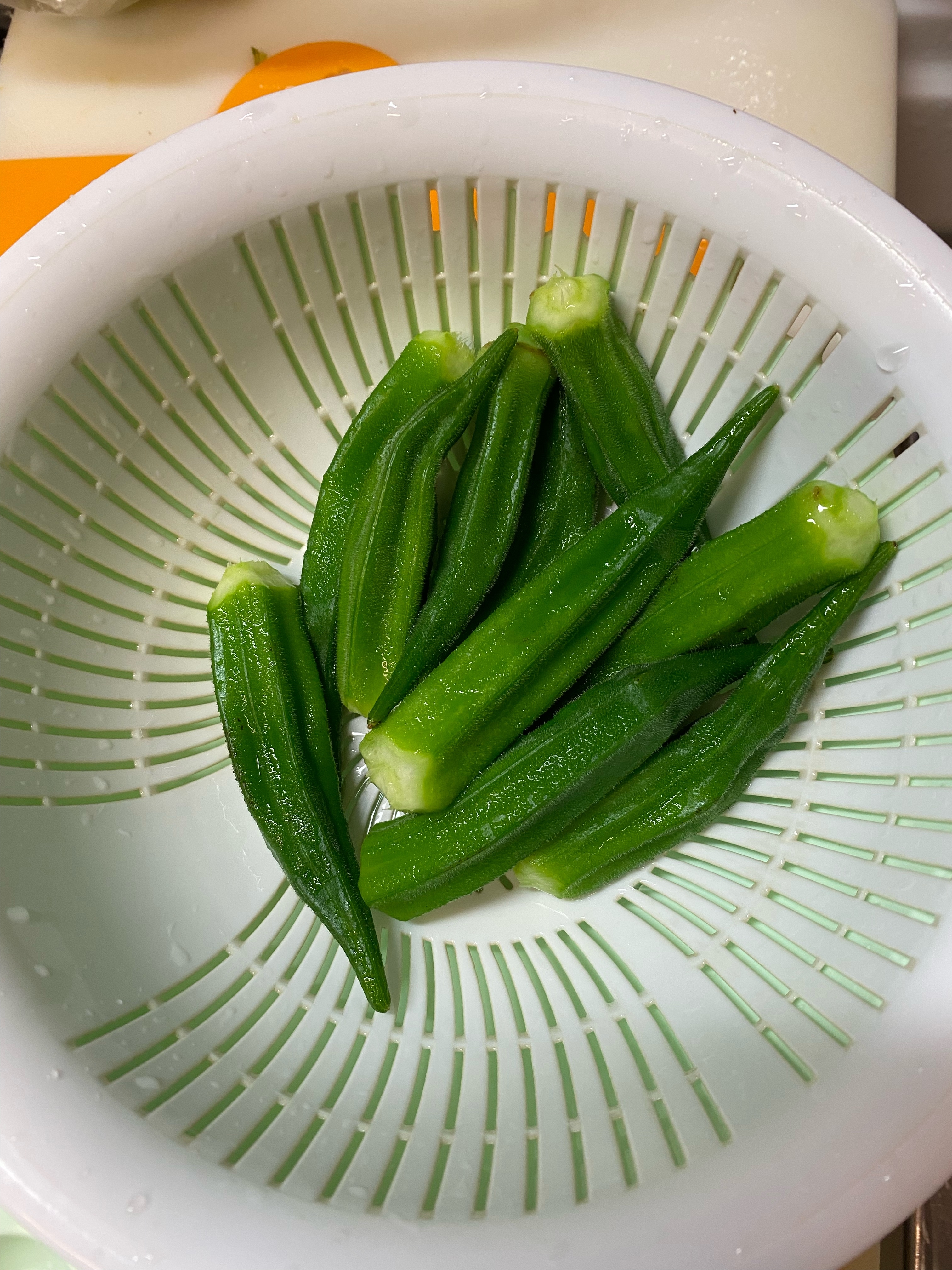 ✳️ヘタを剥く時に剥きづらいものは、硬いオクラだと分かるので、少し長めに塩茹でする(色が鮮やかなうちに冷水に取る)とよいです。 茹でても包丁が入らない位硬いものは、使わない方が無難かも? ※今回、10本中1本は余りにも硬くて廃棄しました