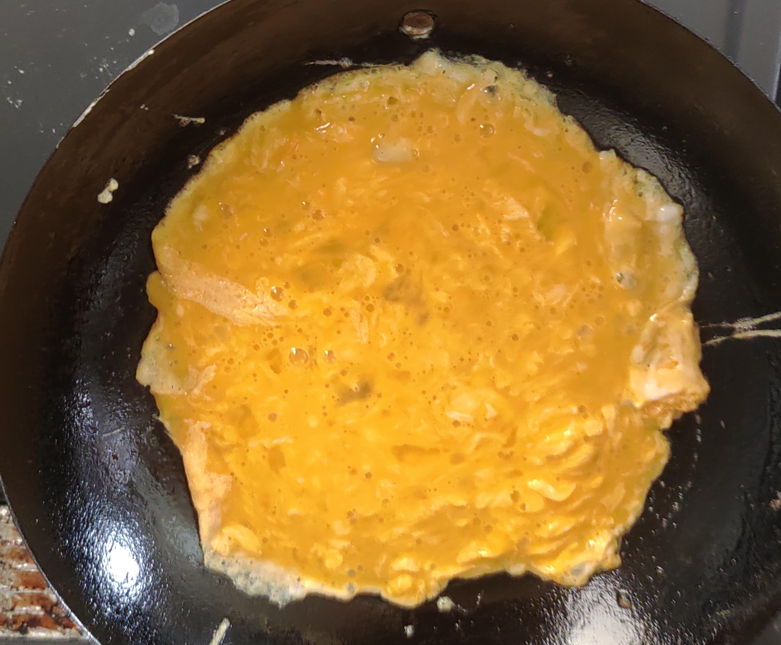 - 6 ②の上にオムレツをのせて完成です