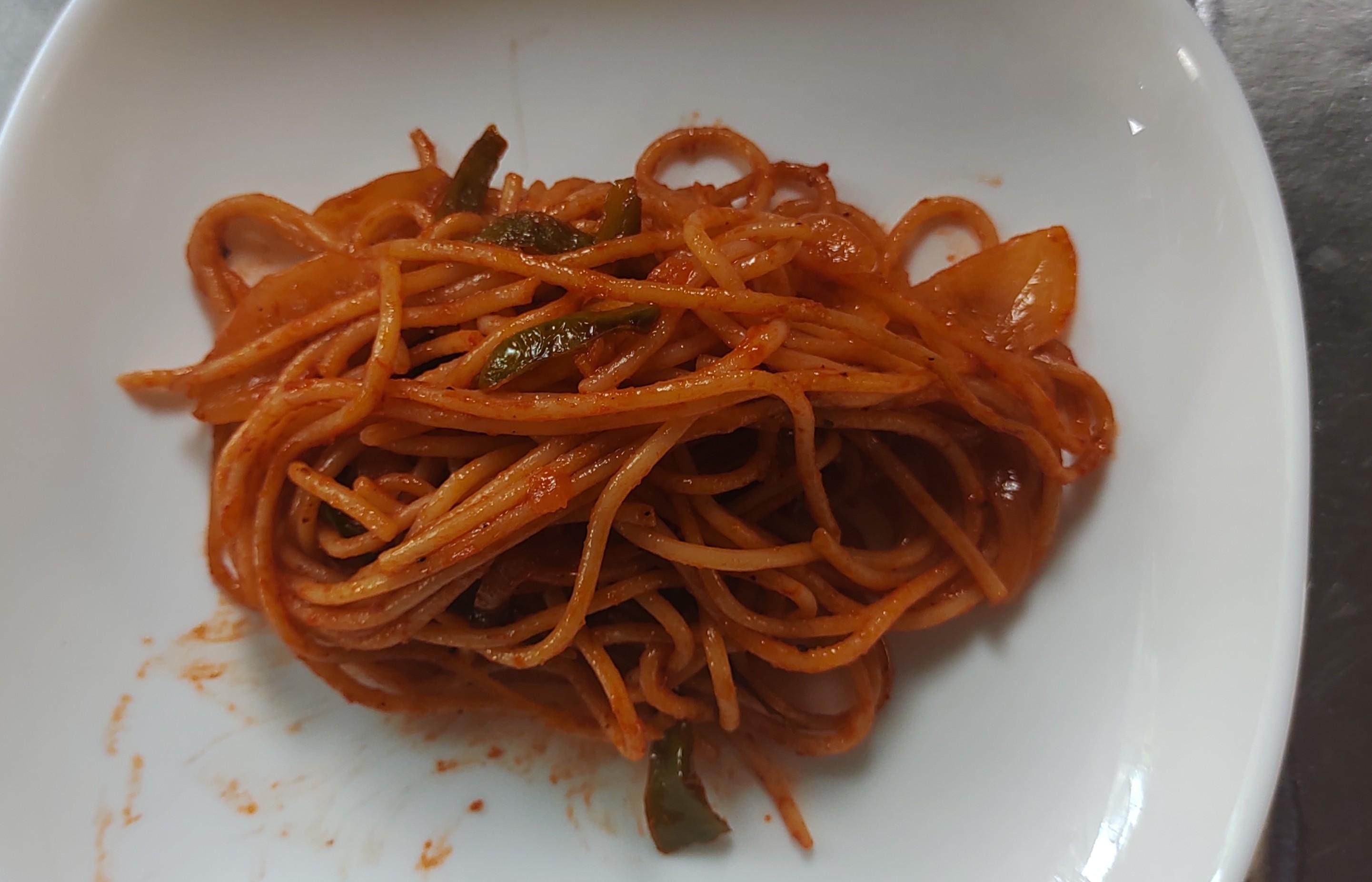 - 1 鍋にベーコン、玉ねぎ、ピーマンを入れて軽く炒めケチャップを入れて酸味を飛ばしてからスパゲッティを入れて混ぜ合わせ塩こしょうして炒める