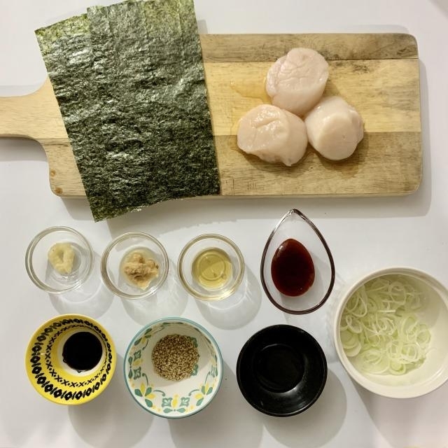 ホタテ、ネギ、海苔をお皿に盛り付けたら完成!