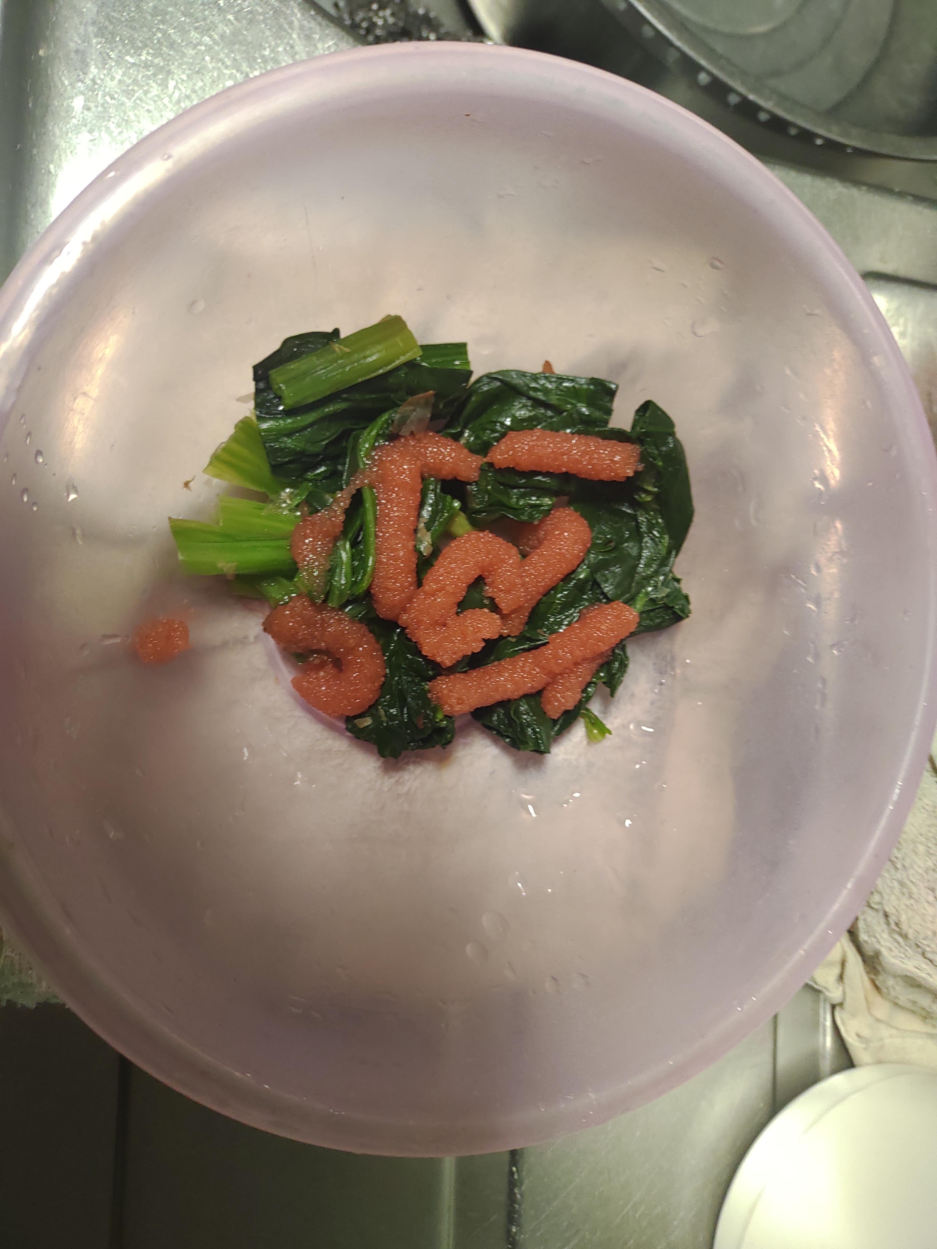 - 4 ほうれん草をあげて水気を切って醤油をかけて混ぜる
