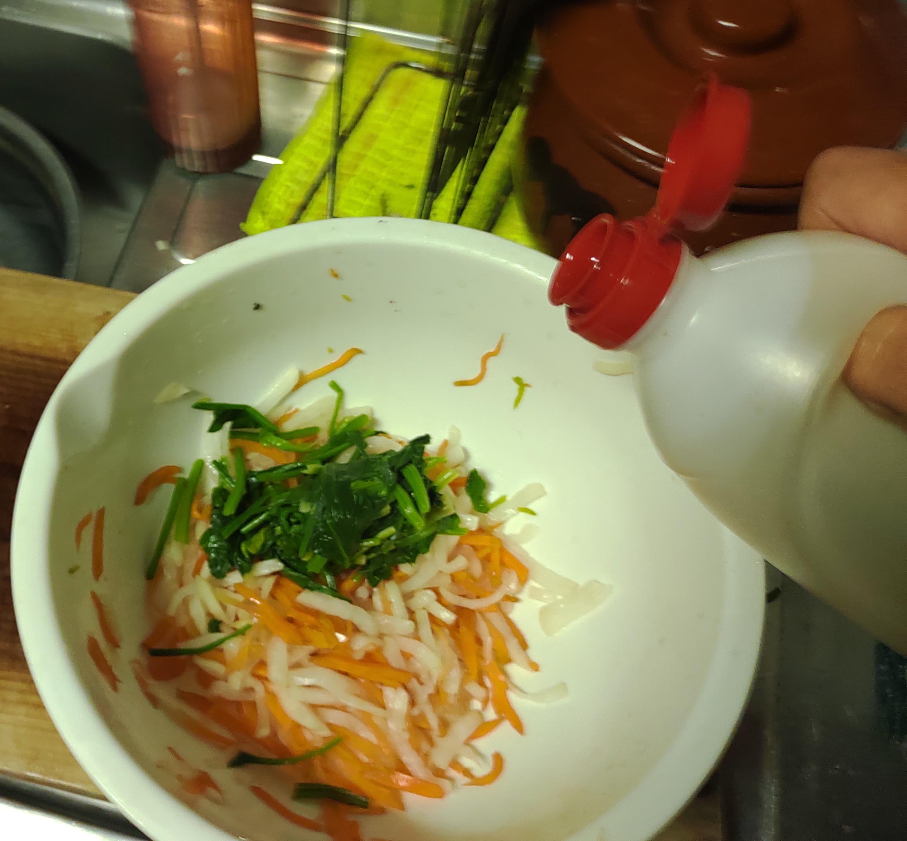 - 1 大根、にんじんを千切りにして塩を加え混ぜ合わせしばらくおいておく