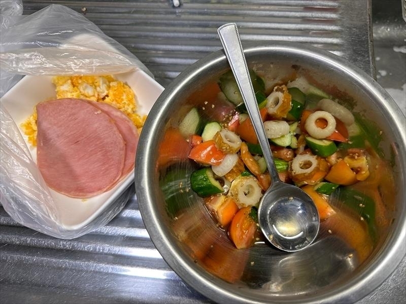 の、荒熱がとれたらボウルに入れる。炒り卵のお皿にハムが見えちゃったかな。