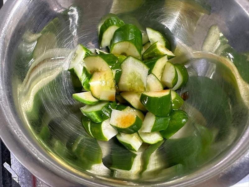きゅうりは少しの塩(分量外)をふって板摺すると余分な水気なくなったり色濃くきれいになったりする、余裕があればやって、包丁を横にして平らな部分でばんばん叩く。
