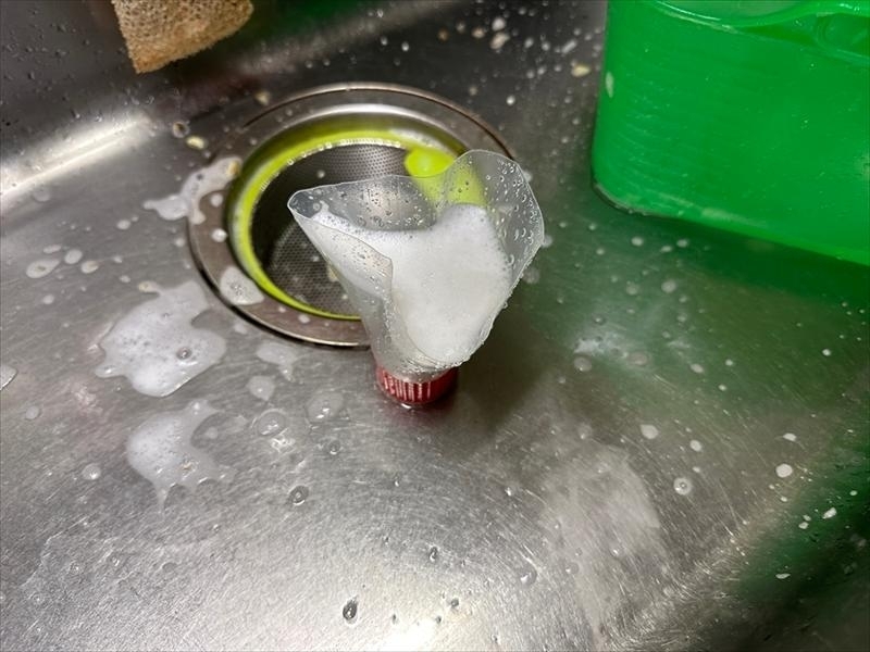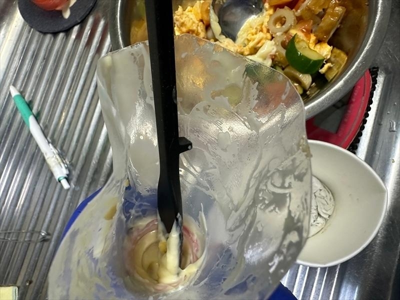 今回はたまたま、あと2㎝位(容器を逆さまにして)を持っていました。明日はプラごみの日だし容器半分からずぱっと切り落としてこの場で千鳥入れてくるくる。使い切りですねまさに酢っきり!