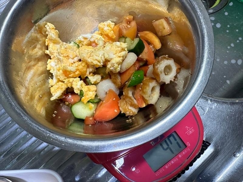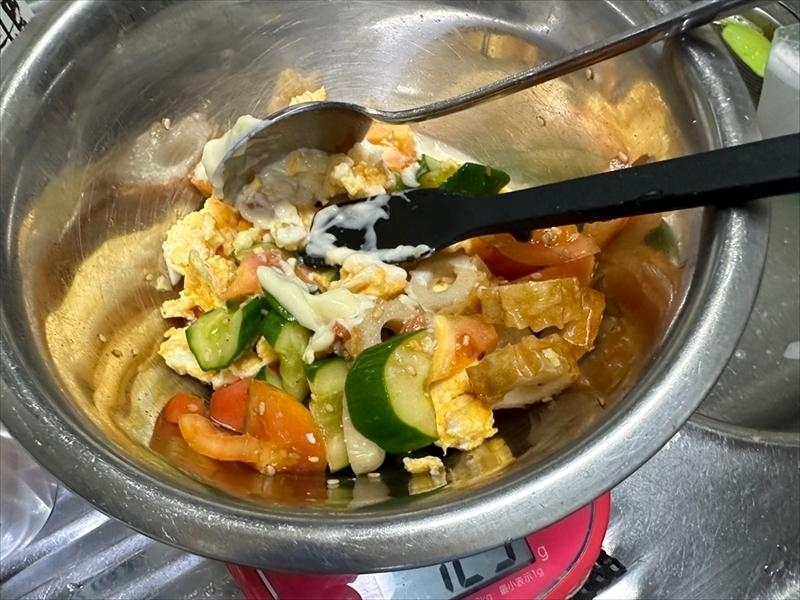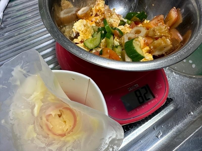 実はこれは朝のお弁当のおかずの残り…つまり荒熱とれた炒り卵を使うよ、ってことね。…に入ったマヨはそんなに味がわかりませんが、竹ちくわとハムが入ってる事を加味してマヨネーズする。