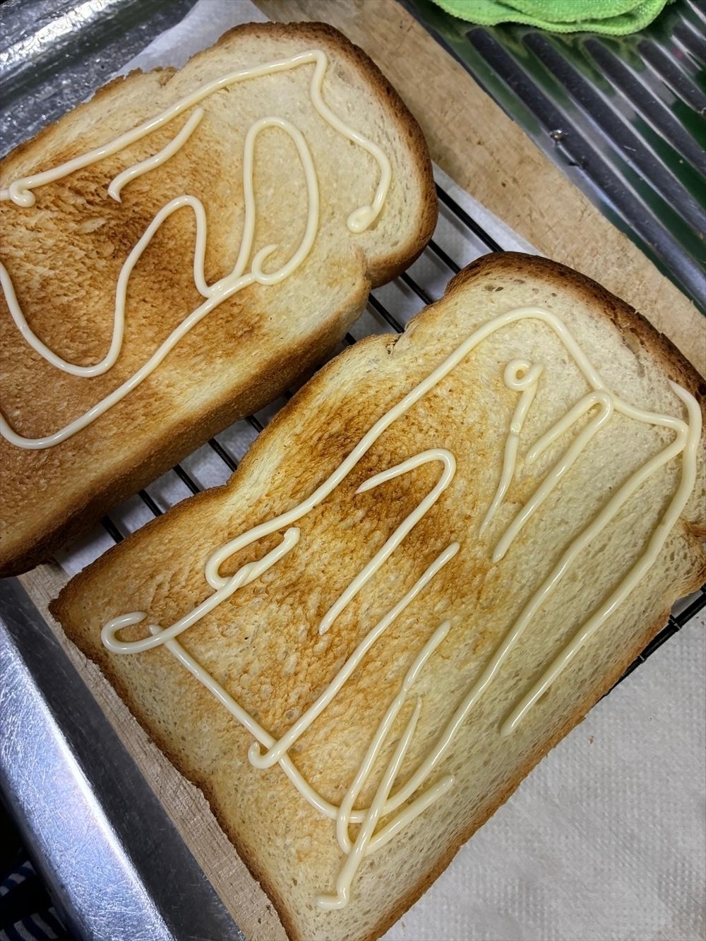土台トーストに、接着と調味の役割として細マヨをうちゅちゅと出す。