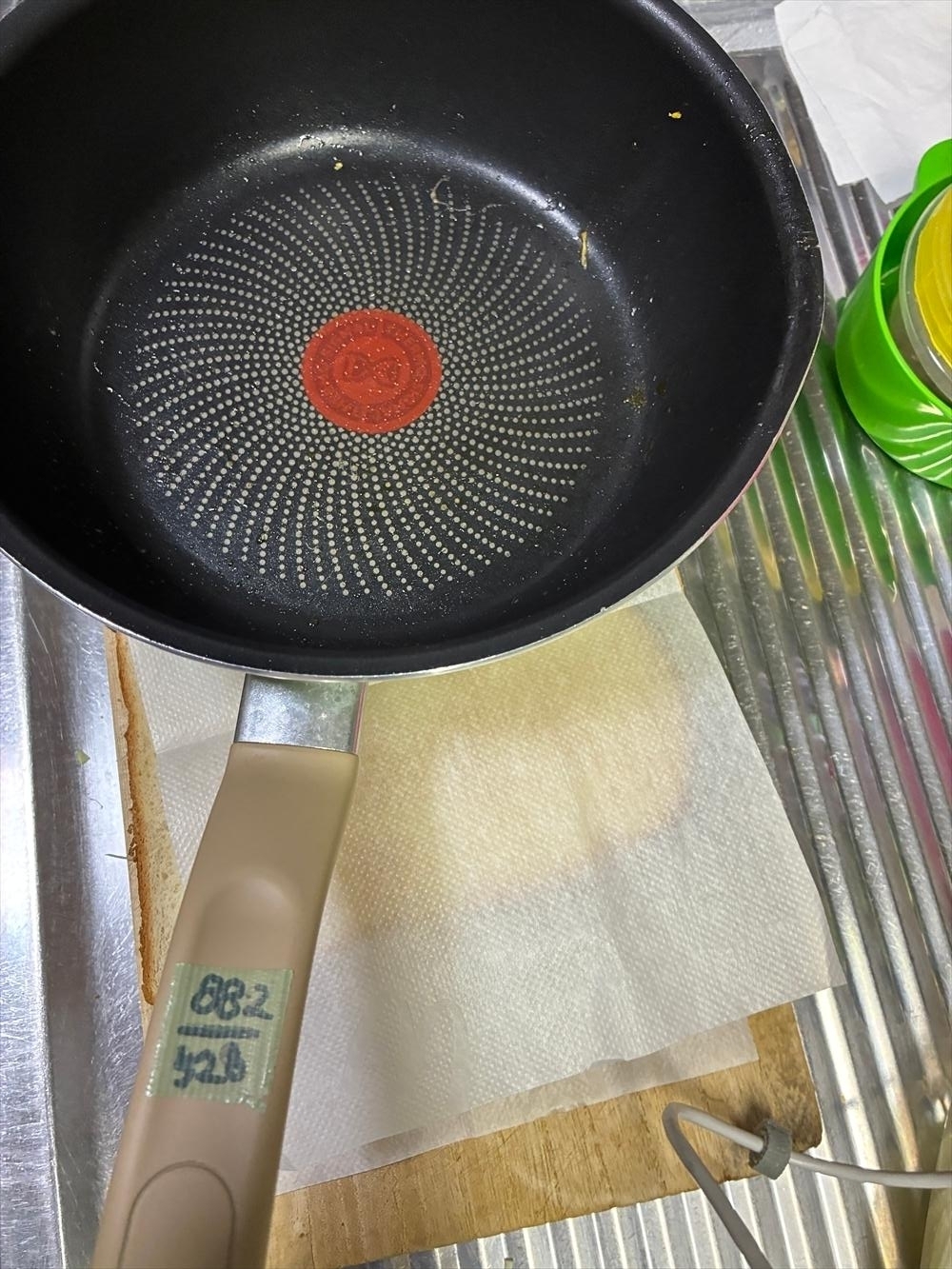 蓋トーストの上に適当な重石…今回はフライパン、熱々で調子いい…を乗せる。