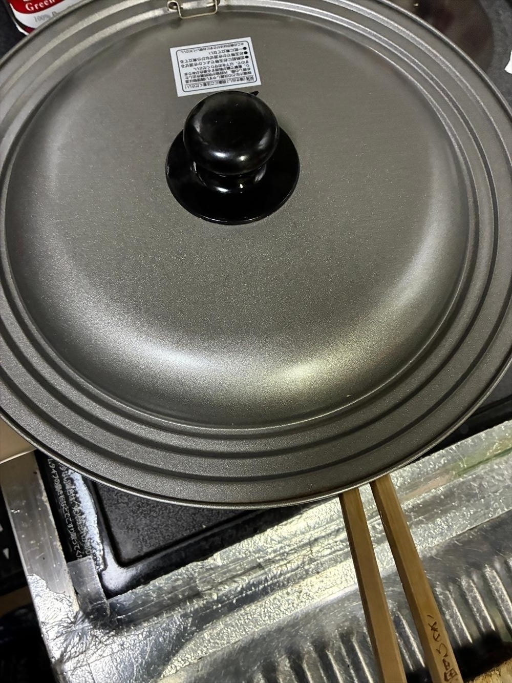 フライパンの蓋を開ける、わぁいチェダーチ、いい感じ。