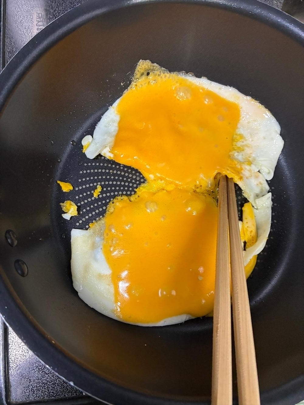 むきになるのが怪しいはさておき、黄身をお箸でやさしくぷちゅっと潰して、そーっと広げる、これを目潰しエッグと呼んでいます。