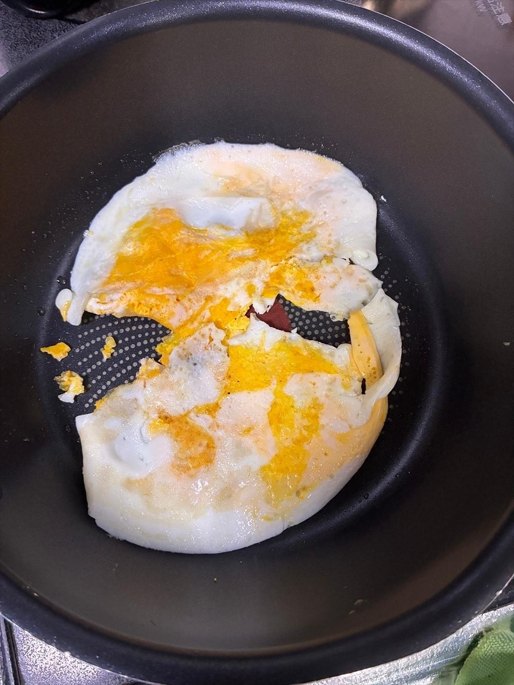 どうしても丸いフライパンでニコタマしたんで、パンの四角ぴったりにはなり得ませんが、まあ、何もない端っこからがぶがぶいって血糖値早めに上げるのもいいかもね腹ペコさんにはさ。