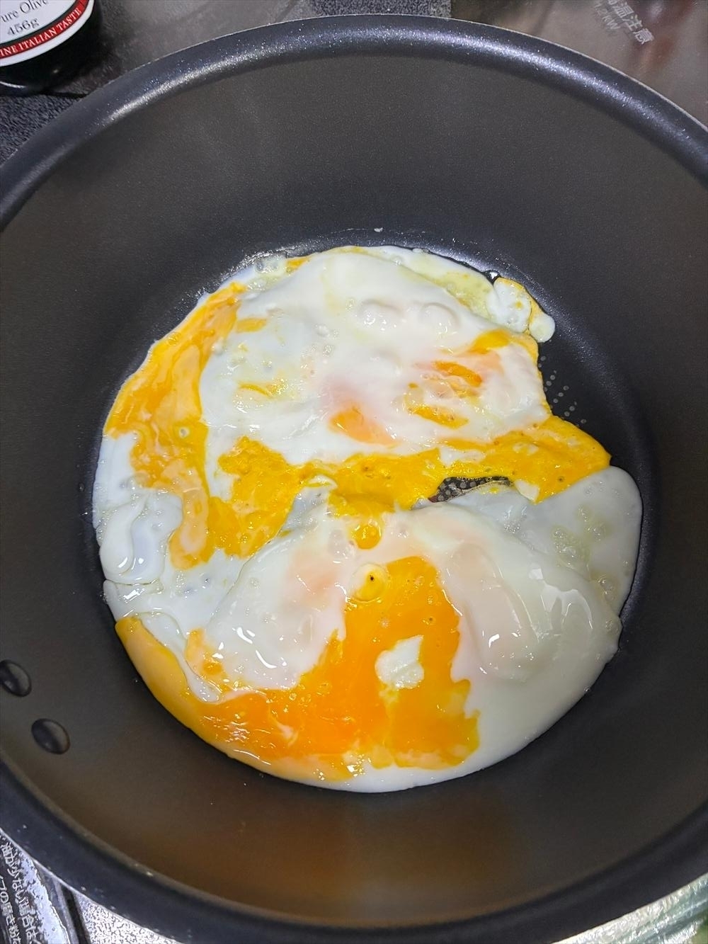 弱めの中火をつけて温めたら卵を二つ割り落とす。