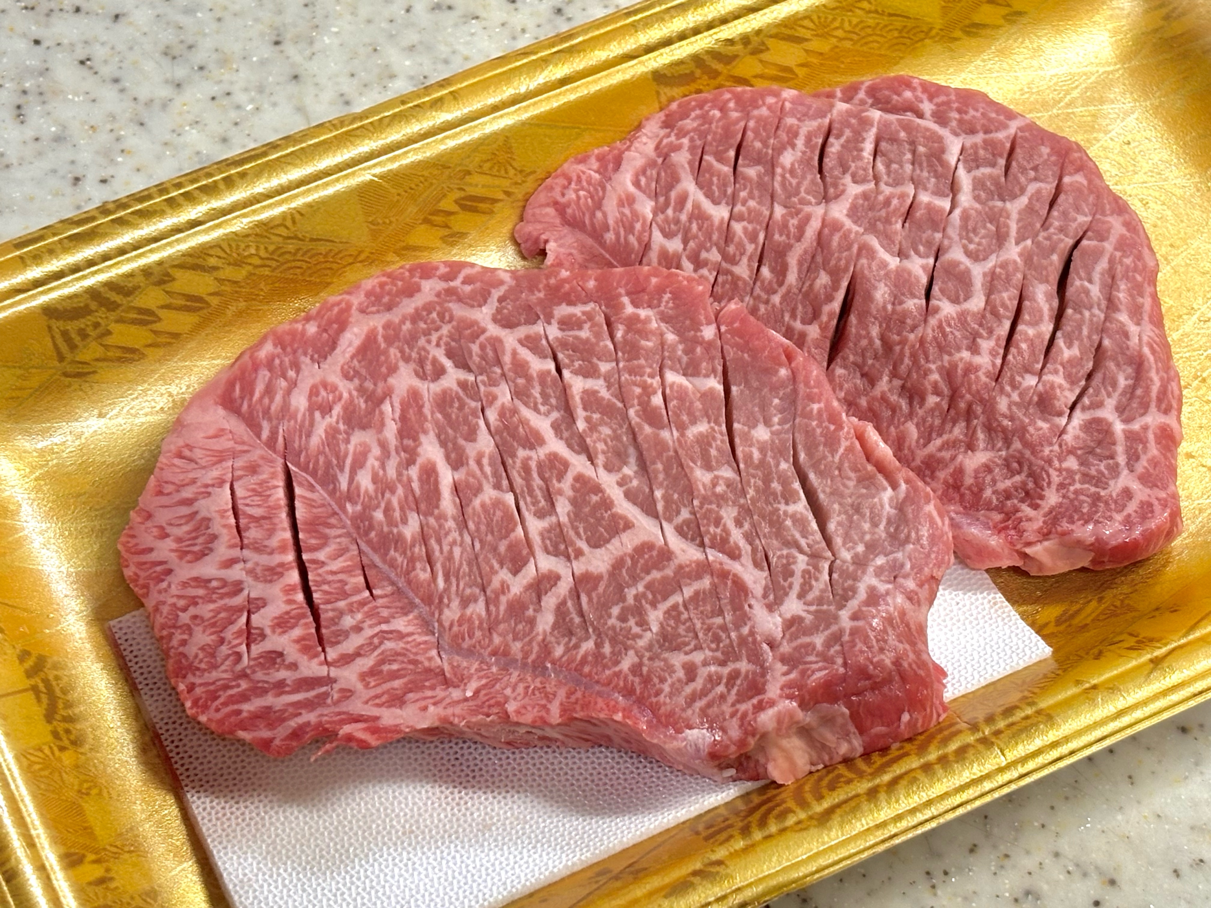 牛ももステーキ用…5㎜間隔ほどの隠し包丁を両面に入れる