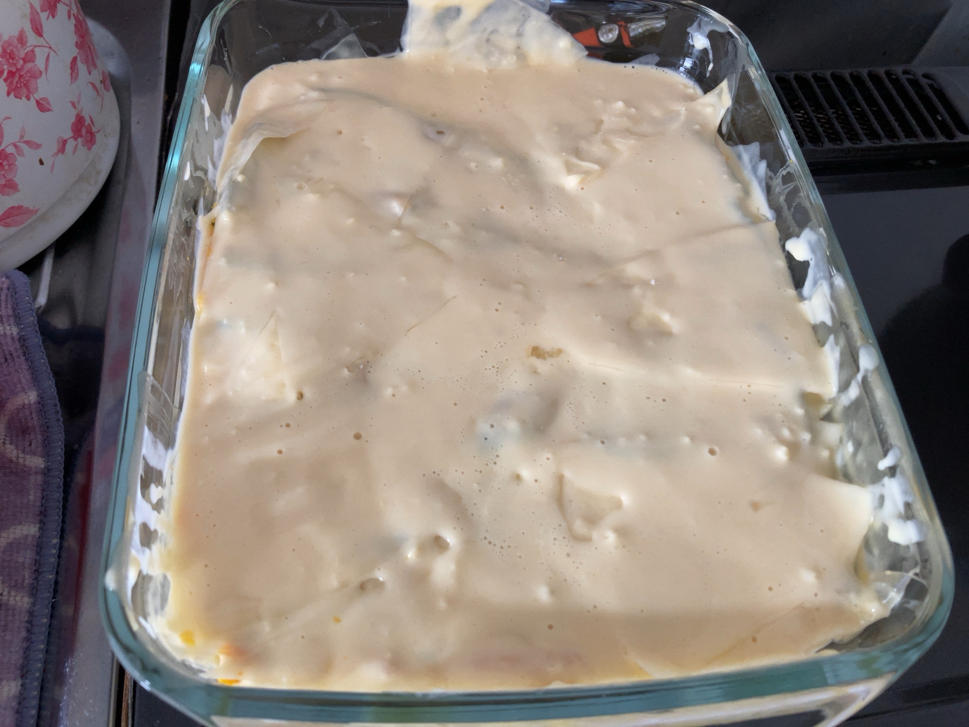 残りの【ライスペーパー(手順4)】を並べたら、残りの【ホットケーキミックス液(手順4)】を全体的に流す