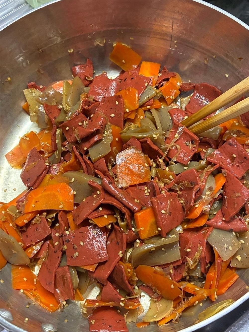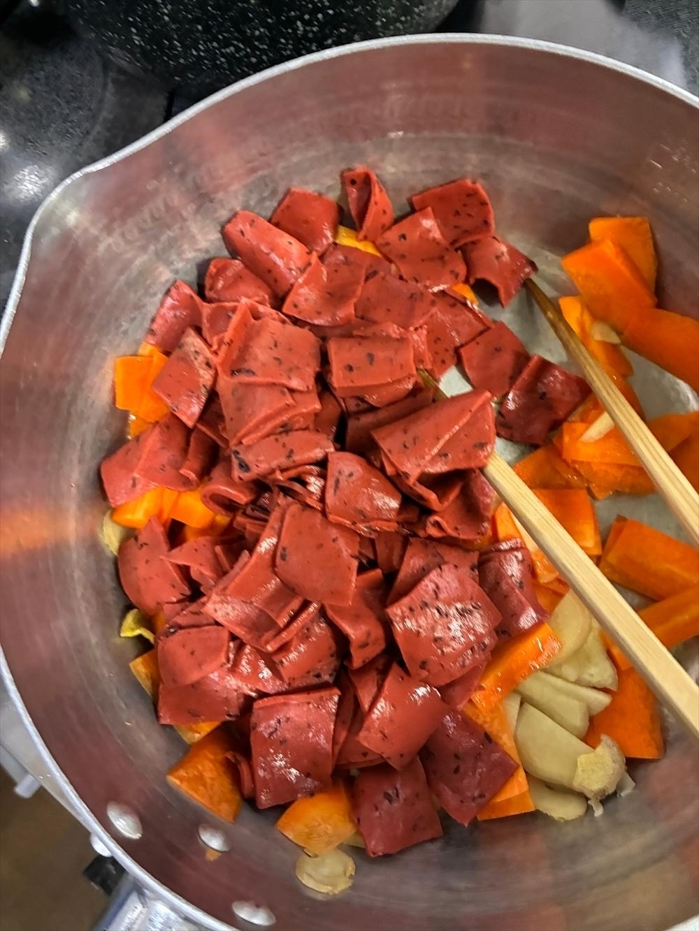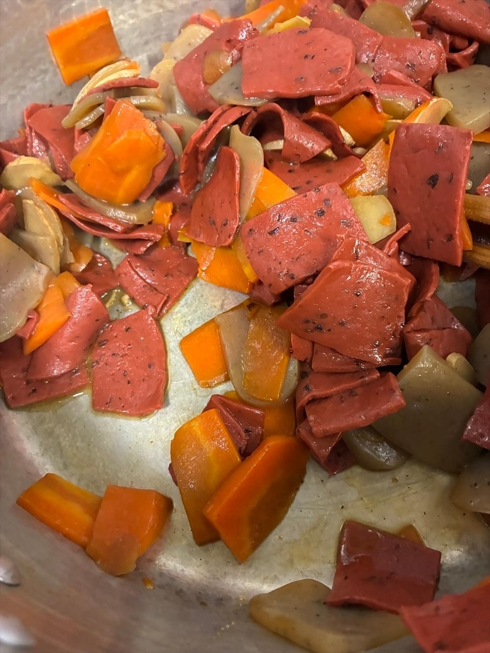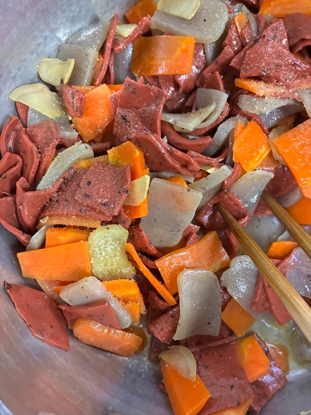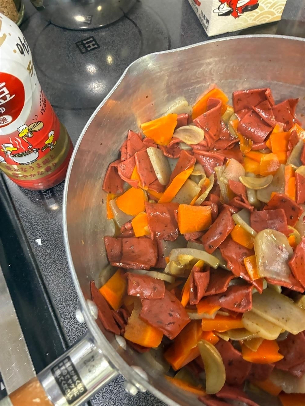 なんてしながらもちゃんと鍋を見てます、人参に半分熱が通った状態。次は灰こんにゃくいきたいんでもう、赤をここにぶちこんじゃいます、火力はそのまま、焦ると焦がすはおんなじ漢字。