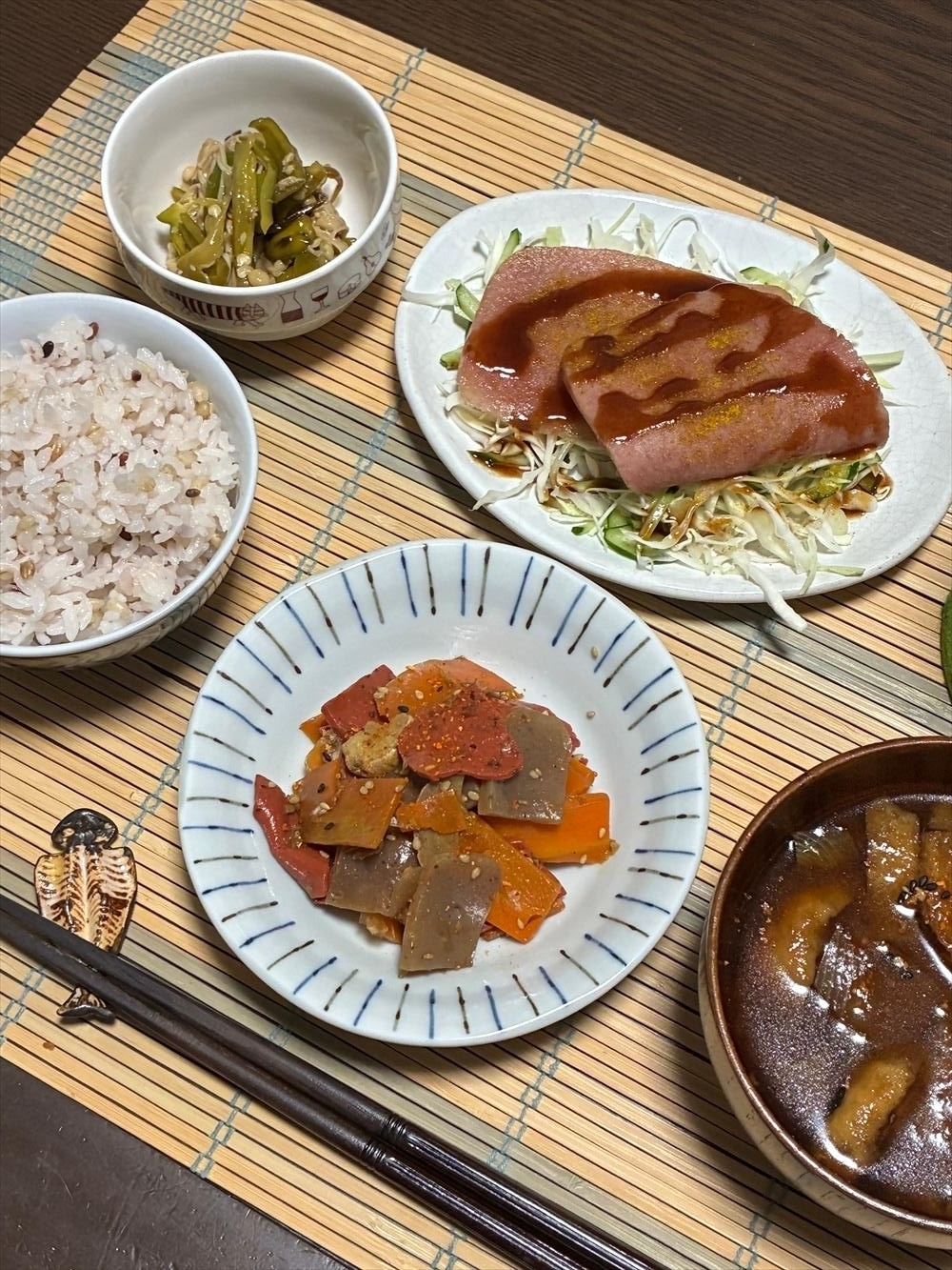 味はね、やっぱこんにゃくはお醤油もう少し入れた方がよかったかな?位ですが人参がしっかり味なので、三位一体で食べすすんでったらいいかと!
