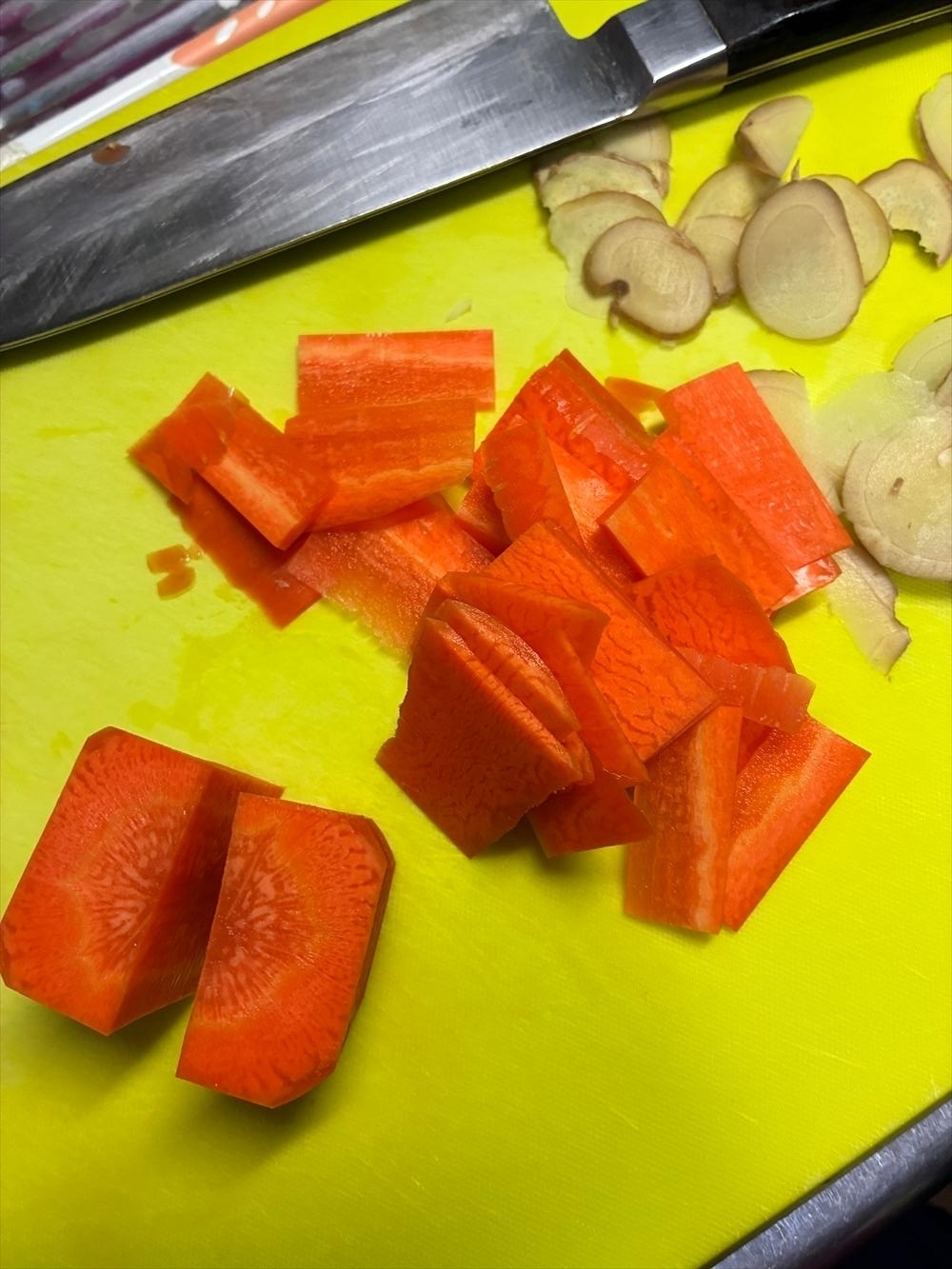 生姜は両こん、人参に比べて遥かに少ないので極薄ライス。どちらもきれいなものであれば皮はついたまま、理由はもう口がすっぱいので割愛。