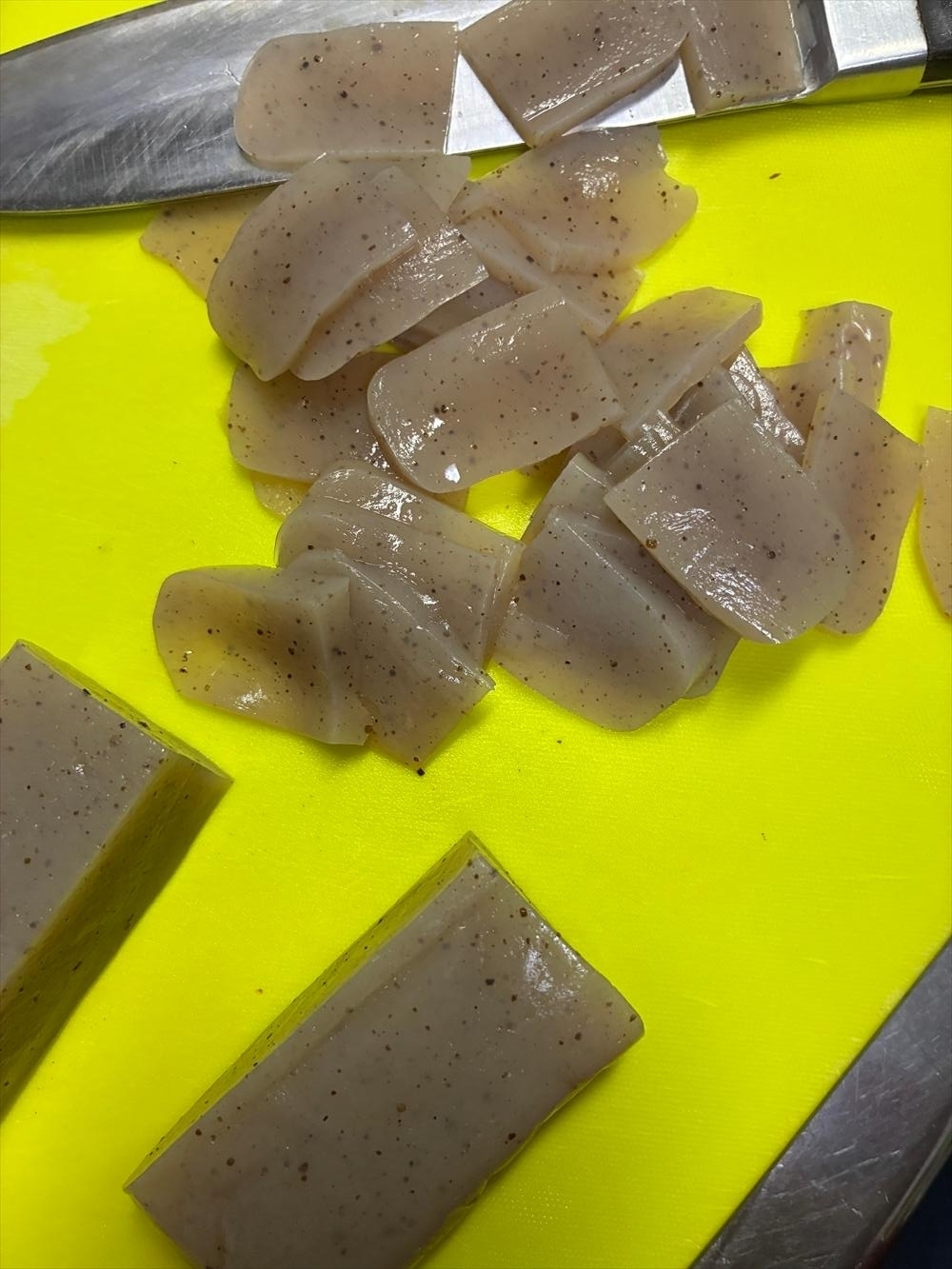 そしてとんとことん、とスライスしていけばいいだけ。あく抜きしてあるからぬるつかず調子よく切れるよ。