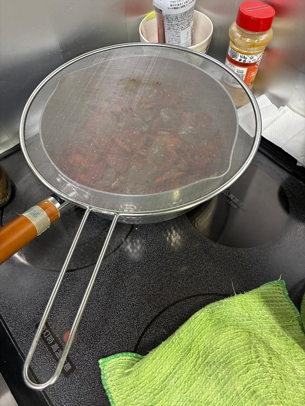 ここんちでは揚げ物の時の油ハネ防止のラケットみたいなやつ、あれをかぶせて荒熱とってます。