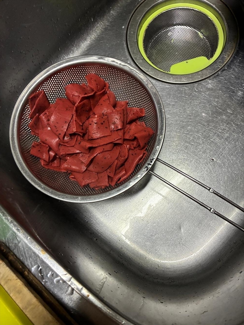 ざるに赤こんにゃく、普通のこんにゃく…以降灰こんにゃくと呼びます、をあけて流水で洗う。