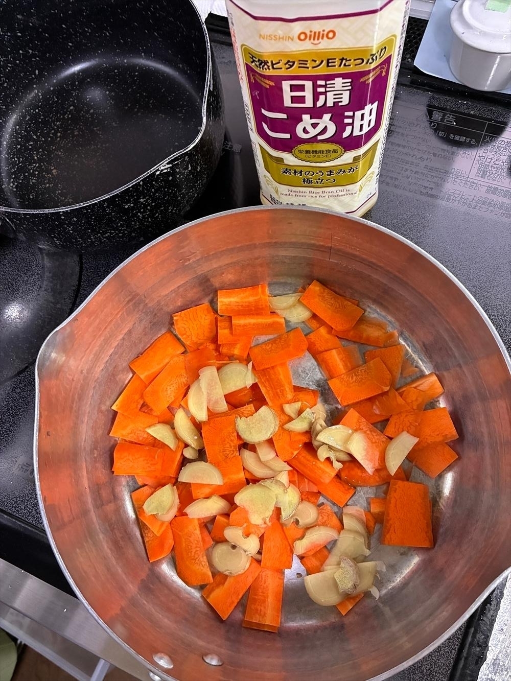 鍋をざっと洗ってふいて人参生姜を炒める、ごま油ではなくこめ油、風味の問題ね。