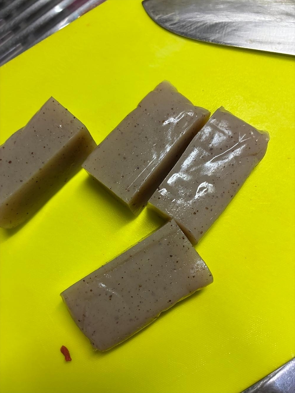さっきの赤こんにゃくの形状を考えると真横にスライスして、縦半分割、