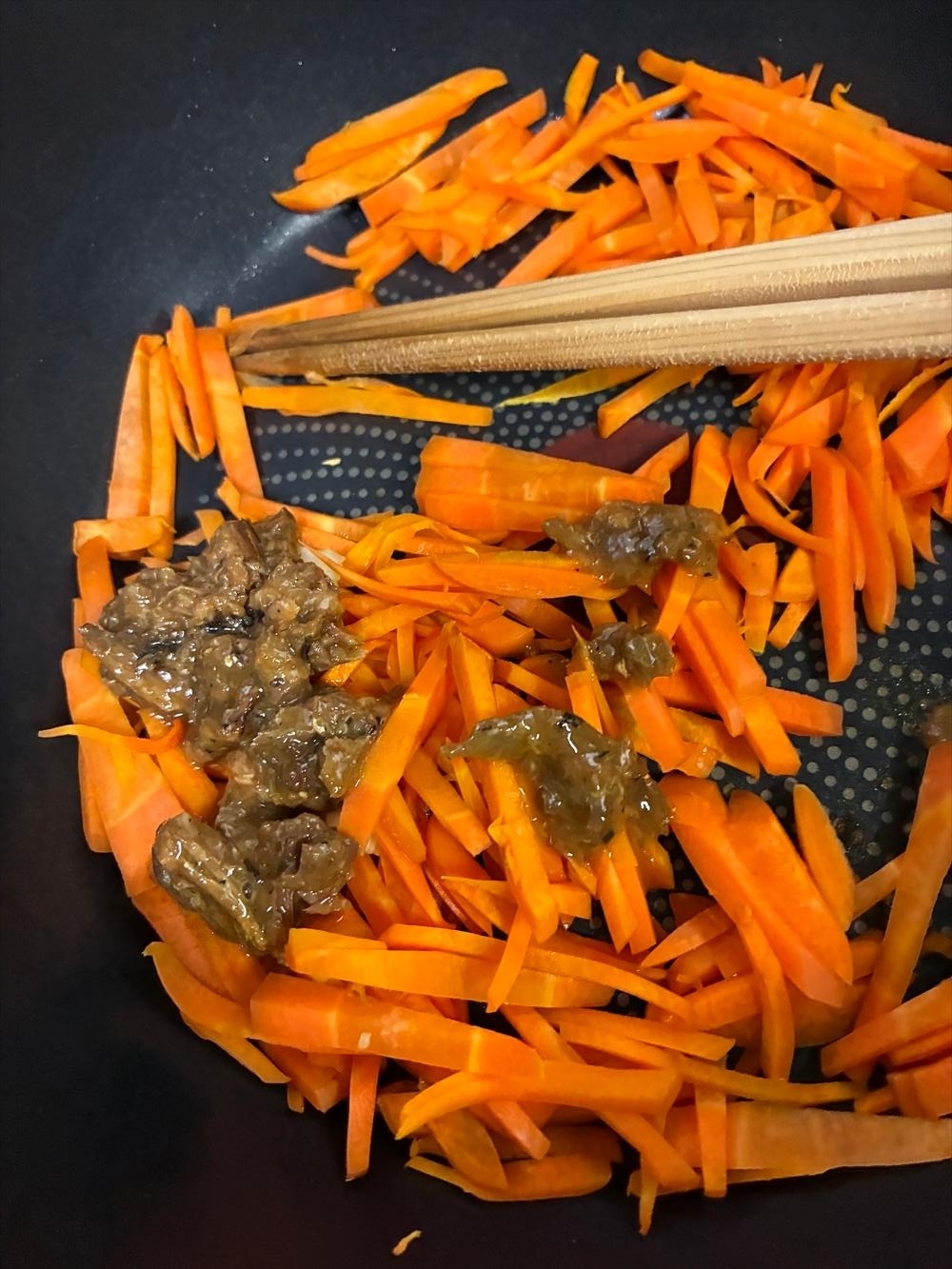 人参の甘さもあるしそもそもいわし蒲焼き缶は甘い食品だから、きんぴらの足し算であるお砂糖お醤油は使わないどいた。