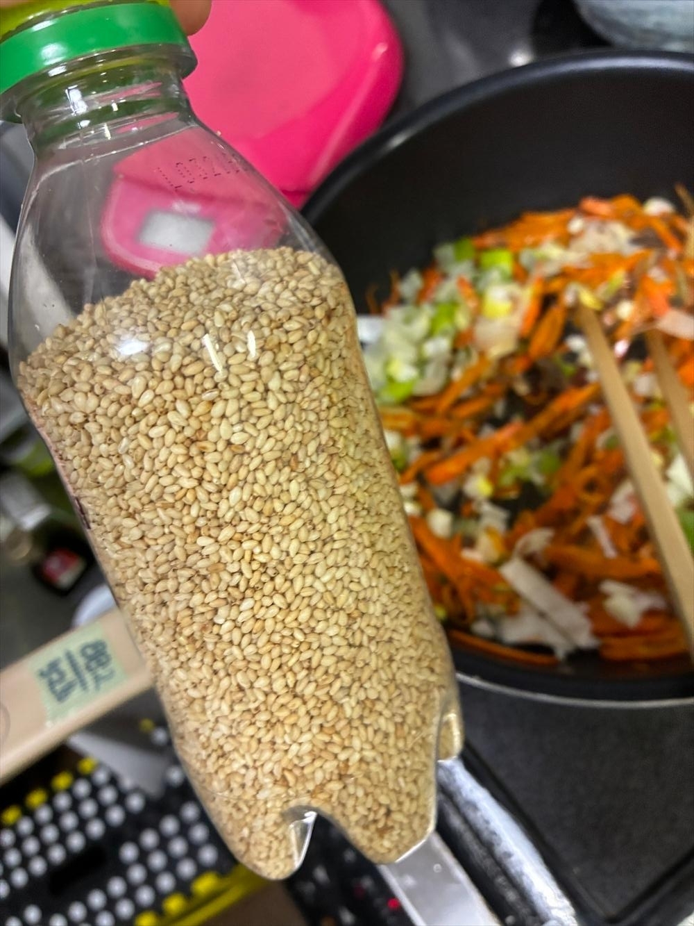 からころ炒めて、ねぎがそんな様子になったら仕上げに白ごまを入れる。