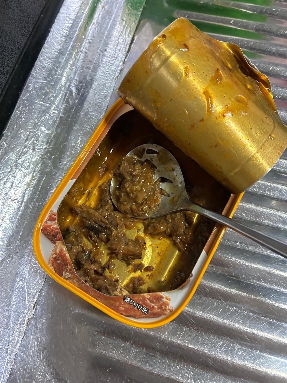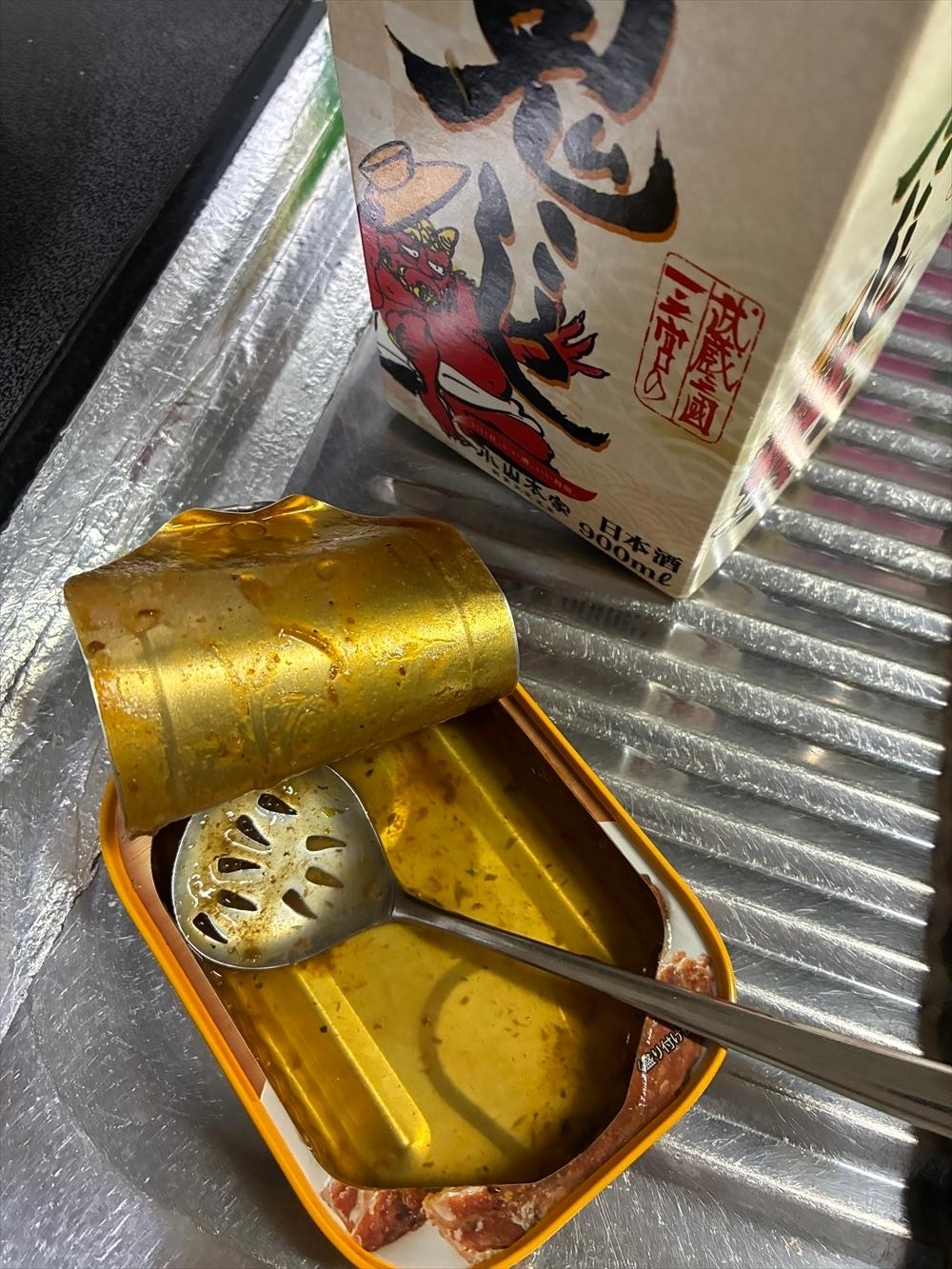 れーっと少し、カタいというか粘度のある汁なのでこうして…お酒をね、空き缶に入れてスプンでしゃかしゃかって使い切ろうか。