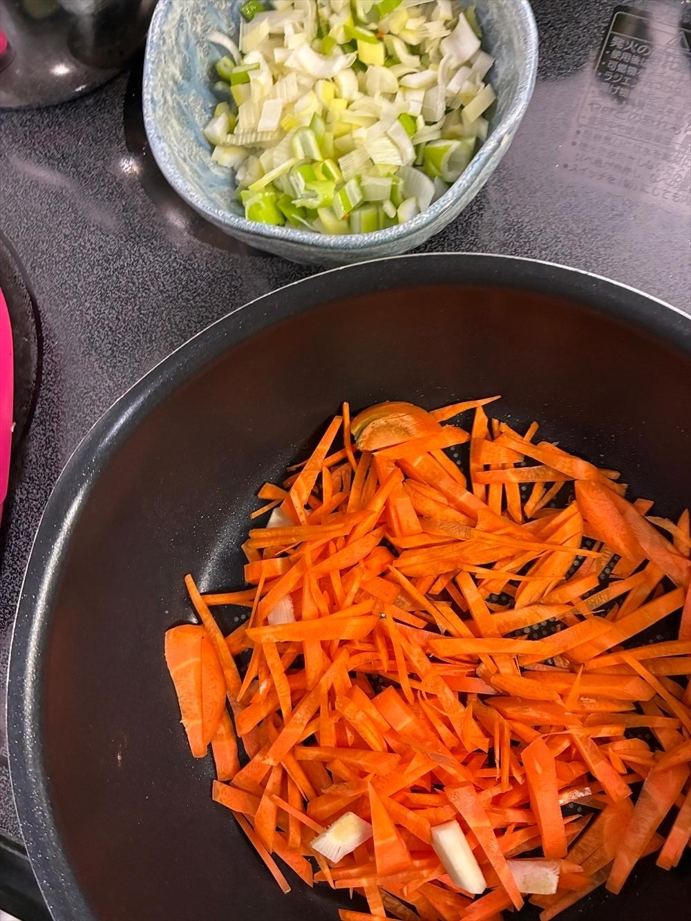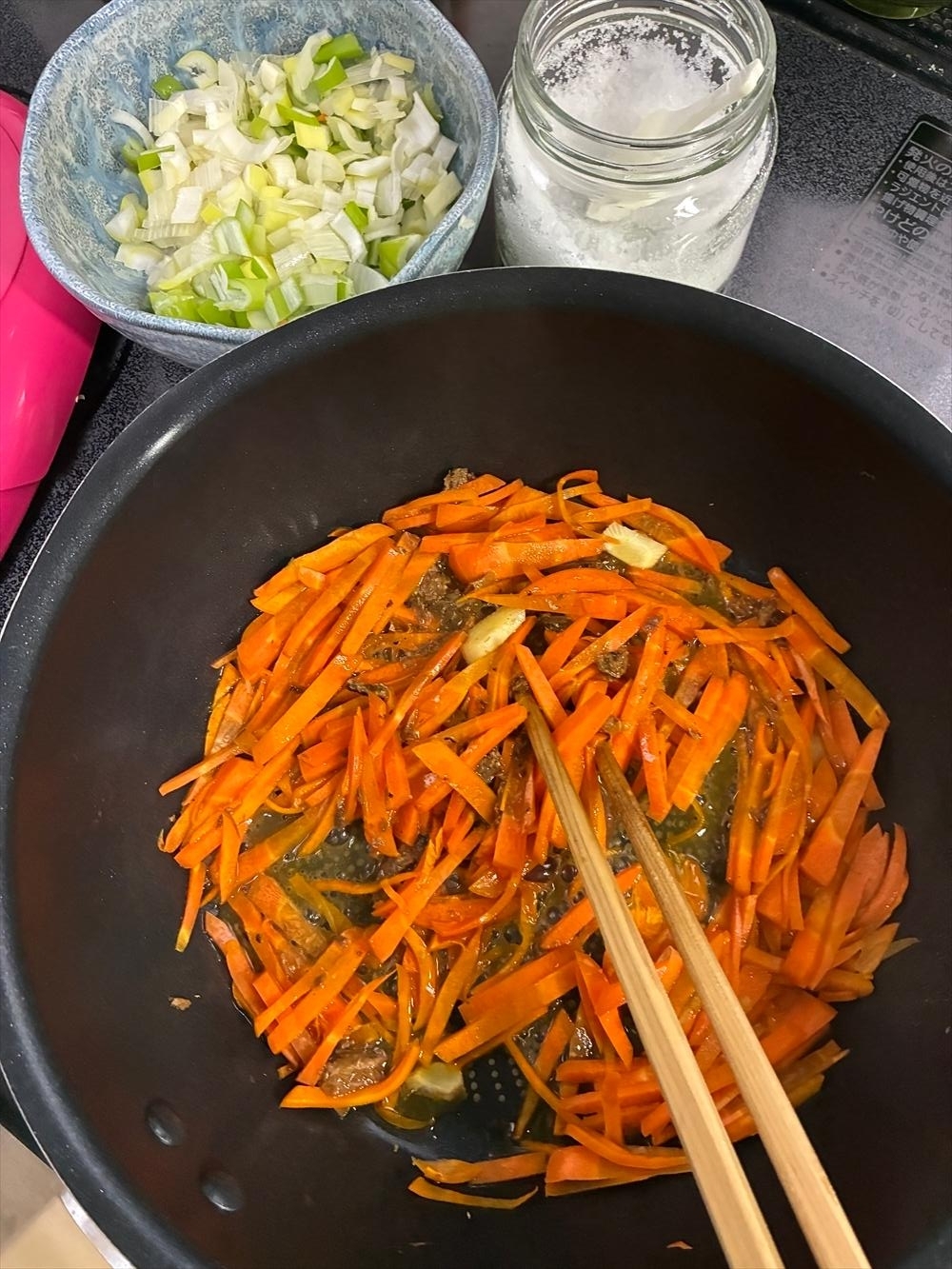 きっかけを書く欄は別にあるはさておき、きんぴらの人参様に細く刻んでフライパンに。