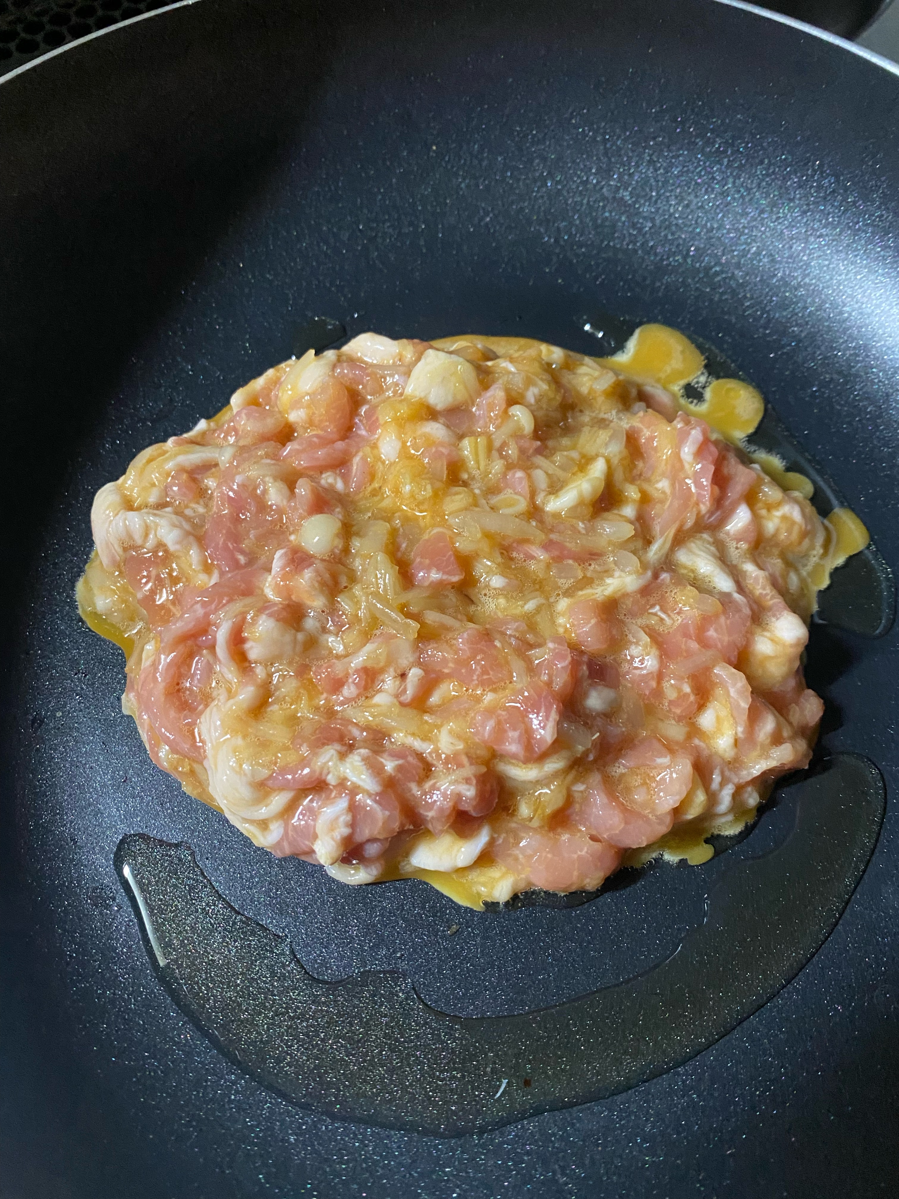 すべてがまざったところで、卵をわりいれ、まぜあわせたら、フライパンに油をひいたなかに、ながしいれる。