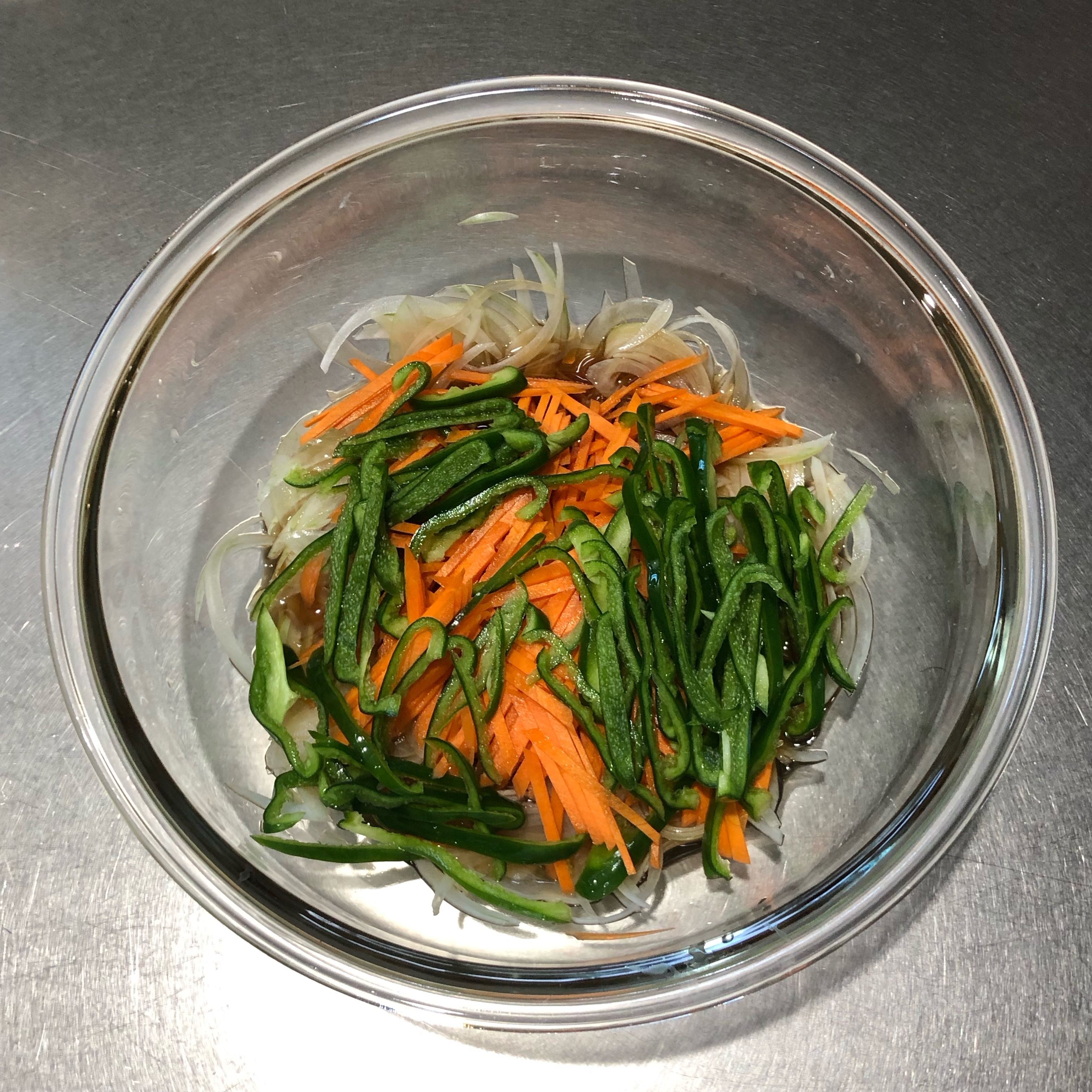 玉ねぎは薄切りに、にんじんとピーマンは細切りにし、★の入った耐熱容器に入れる。ふんわりラップをしたら、電子レンジ(600w)で3分加熱する。