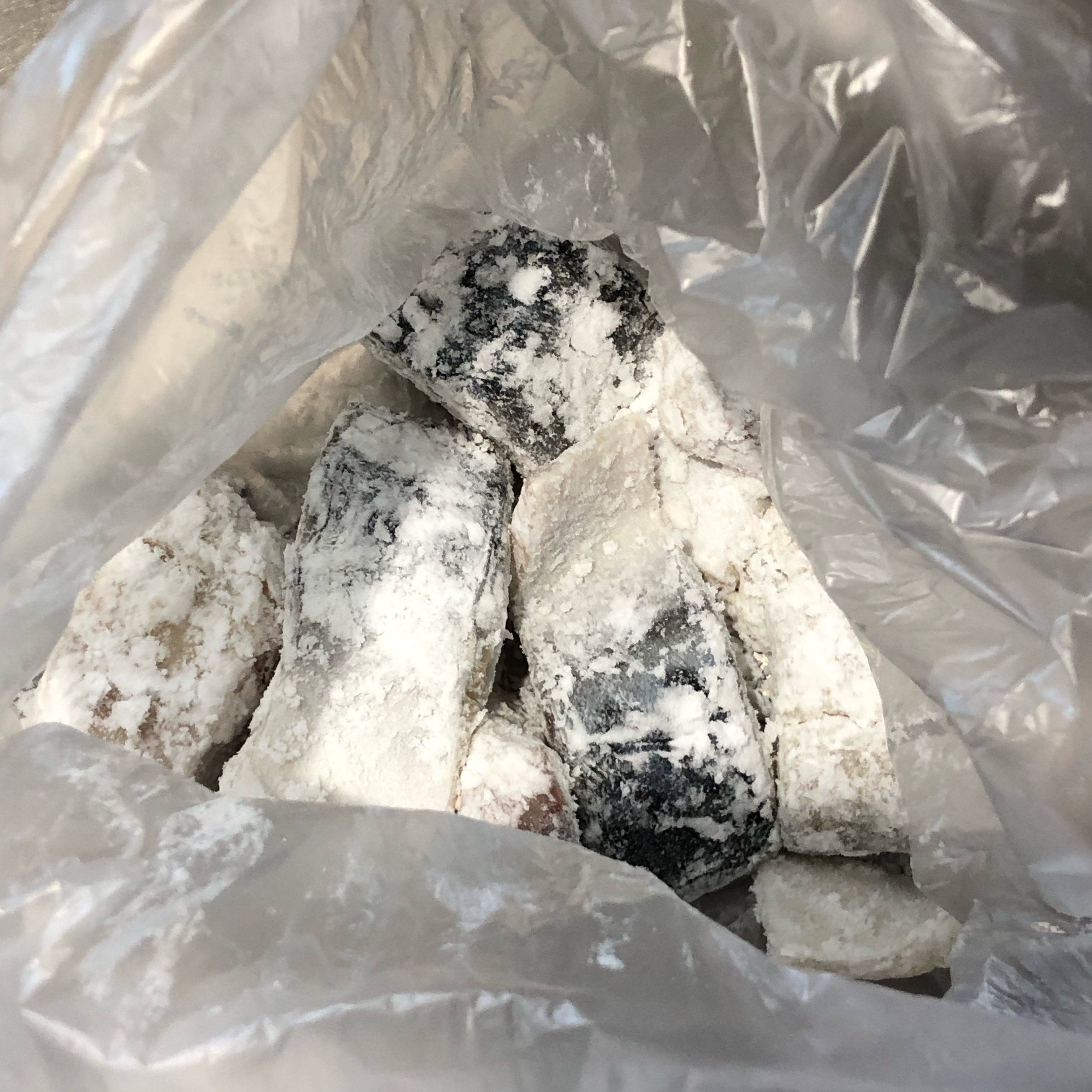 塩鯖は食べやすい大きさに切り、片栗粉をまぶす。