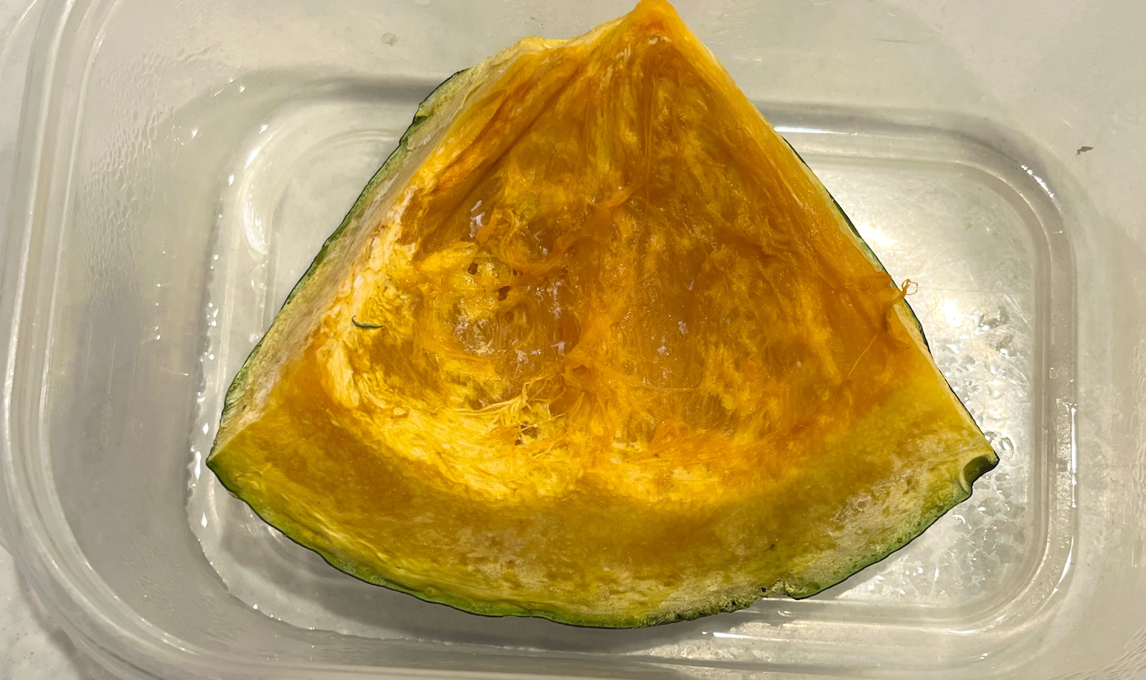 かぼちゃは種を取り除き耐熱容器に水と一緒に入れる