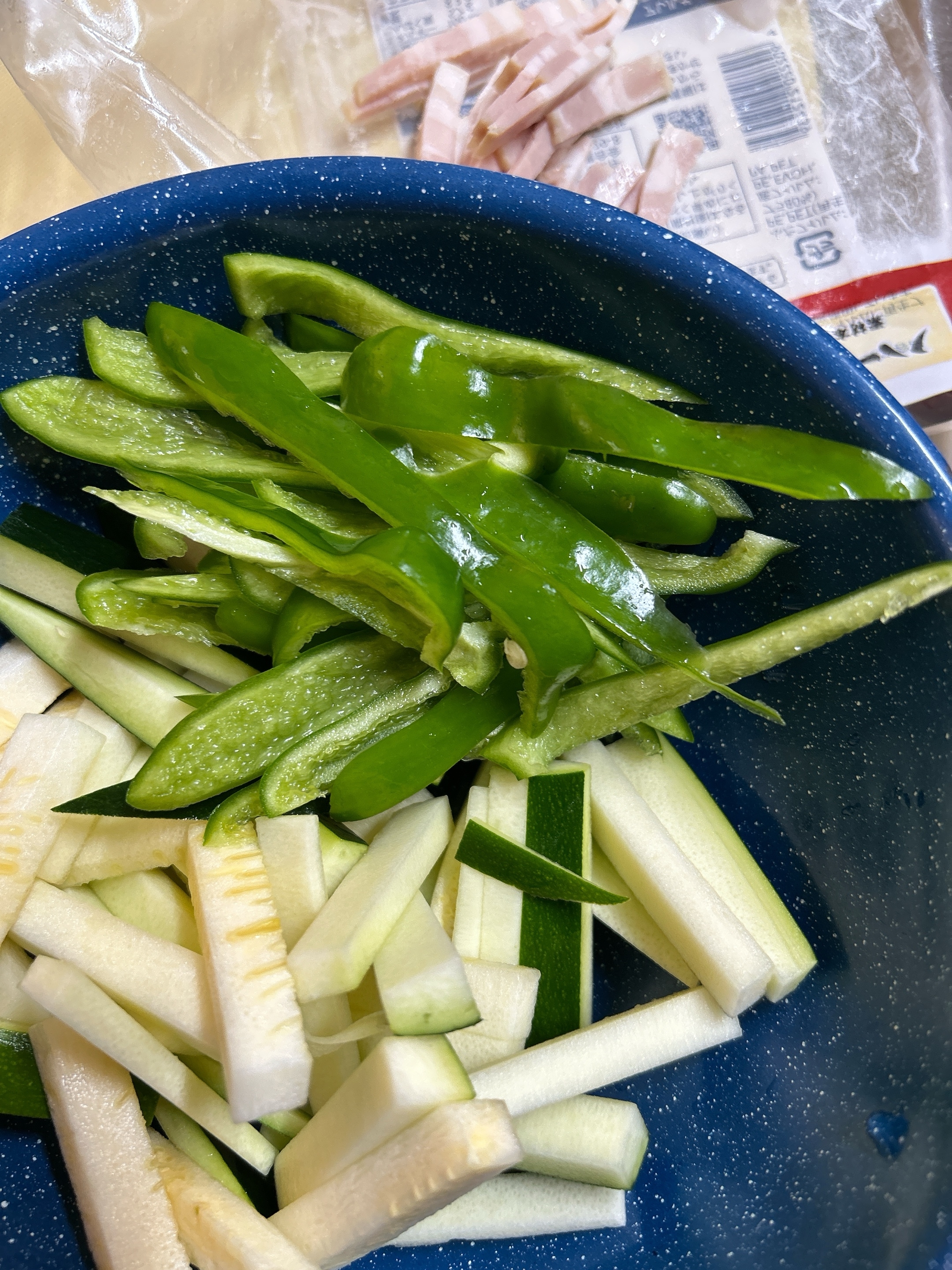 ズッキーニは縦方向に太めの拍子切りに、ピーマン、 ベーコンも細切りにします。赤唐辛子はハサミで輪切りにしておきます