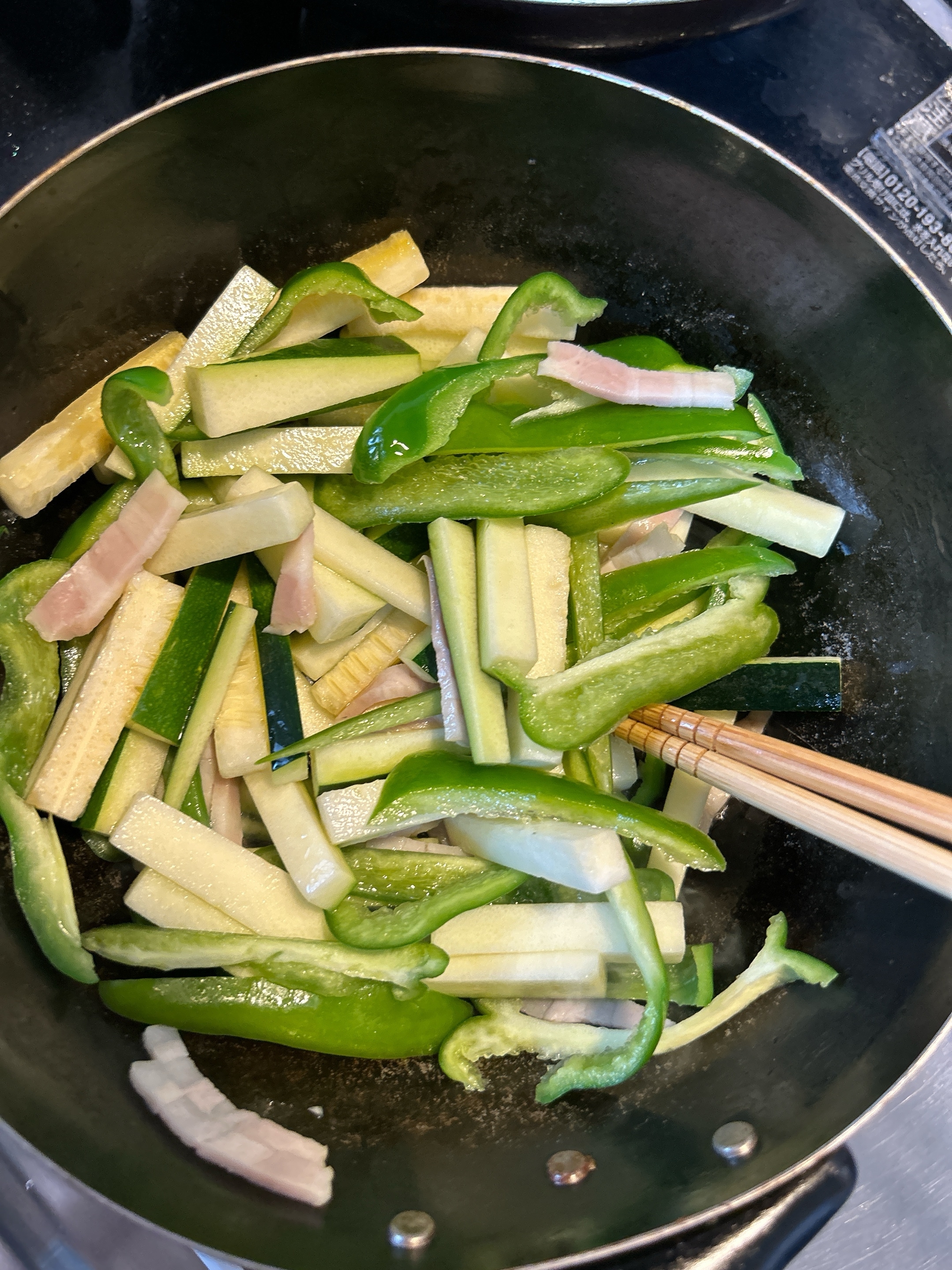 ズッキーニは水分が多く、ピーマンも炒め過ぎは美味しくなくなるので調味料を入れたら火を強めに変えます。 水分は飛びませんが 少し残る程度でOK