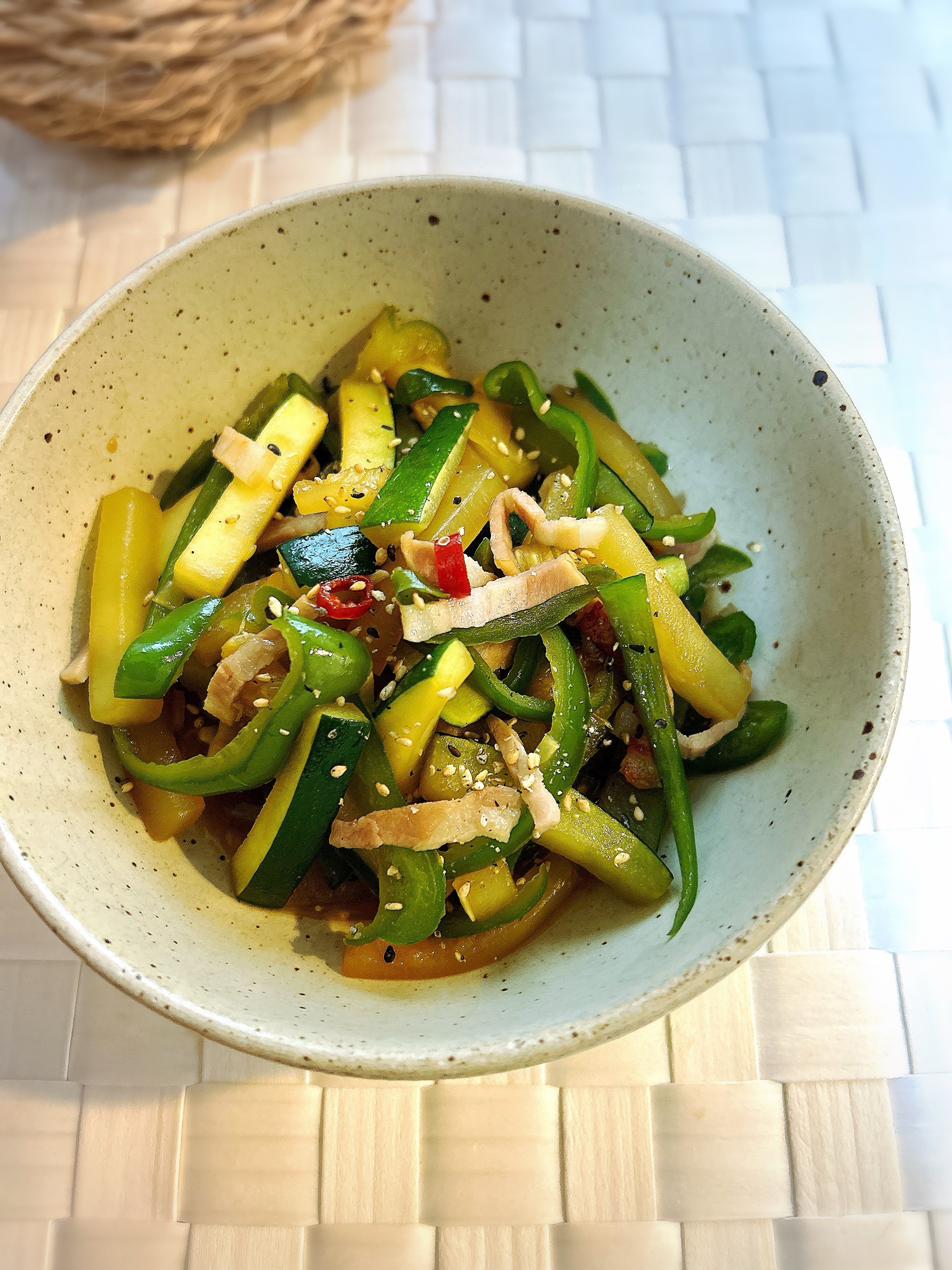 深めのフライパン または厚手のお鍋にごま油を入れて ベーコン、赤唐辛子、ズッキーニ、ピーマンの順に加えて中火で炒めます。ズッキーニにツヤが出たら