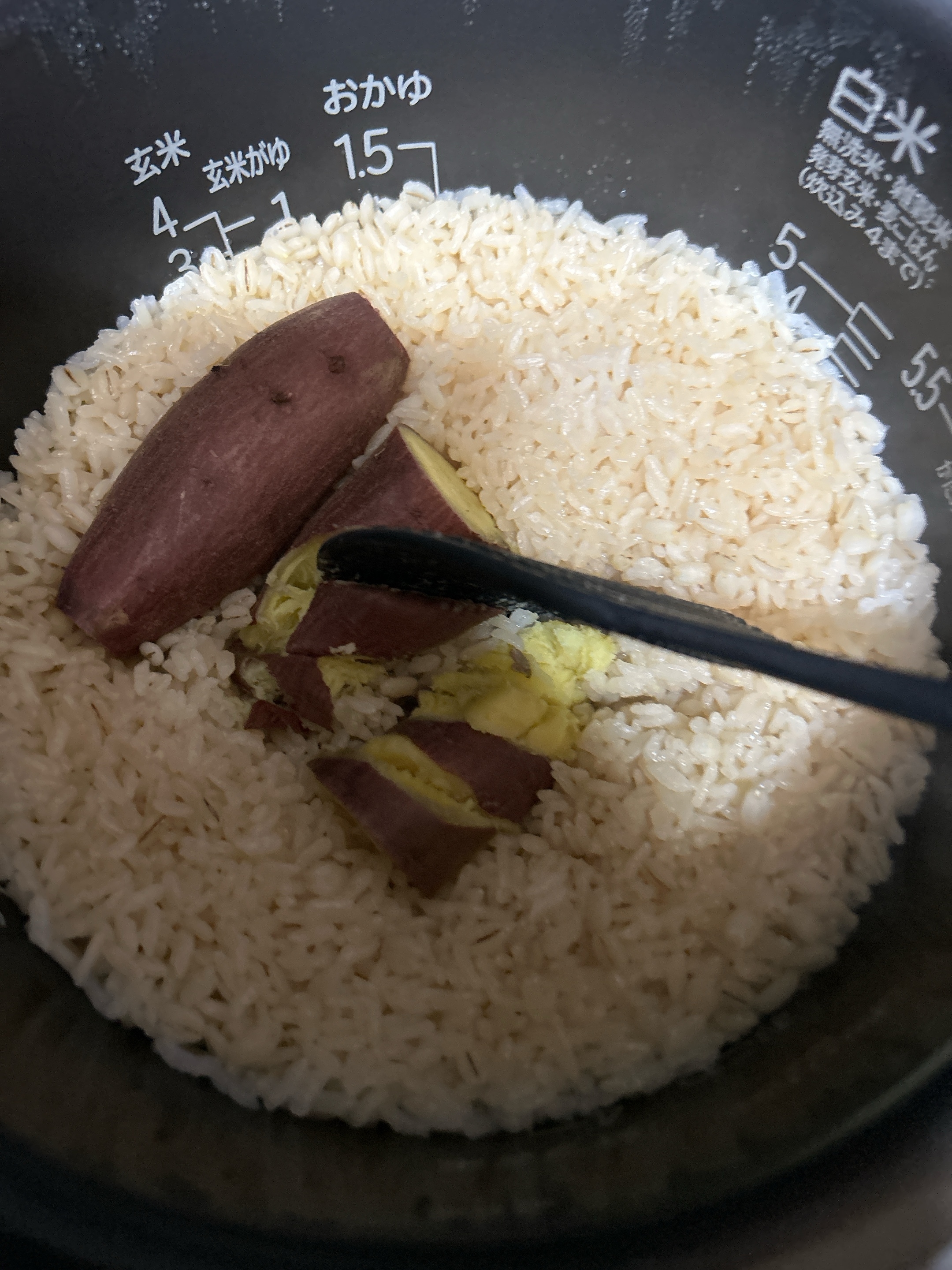 炊けたら10分は蒸らして さつまいもはここで 切るようにほぐしてからザックリ混ぜたら