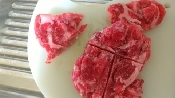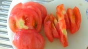 トマトのヘタを取り除き 1cm 幅に輪切りにカットする さらに 棒状になるように 1cm幅に カットする
