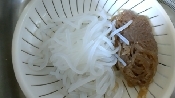 マロジーと糸こんにゃく をざるにあげて 水気を 取っておく