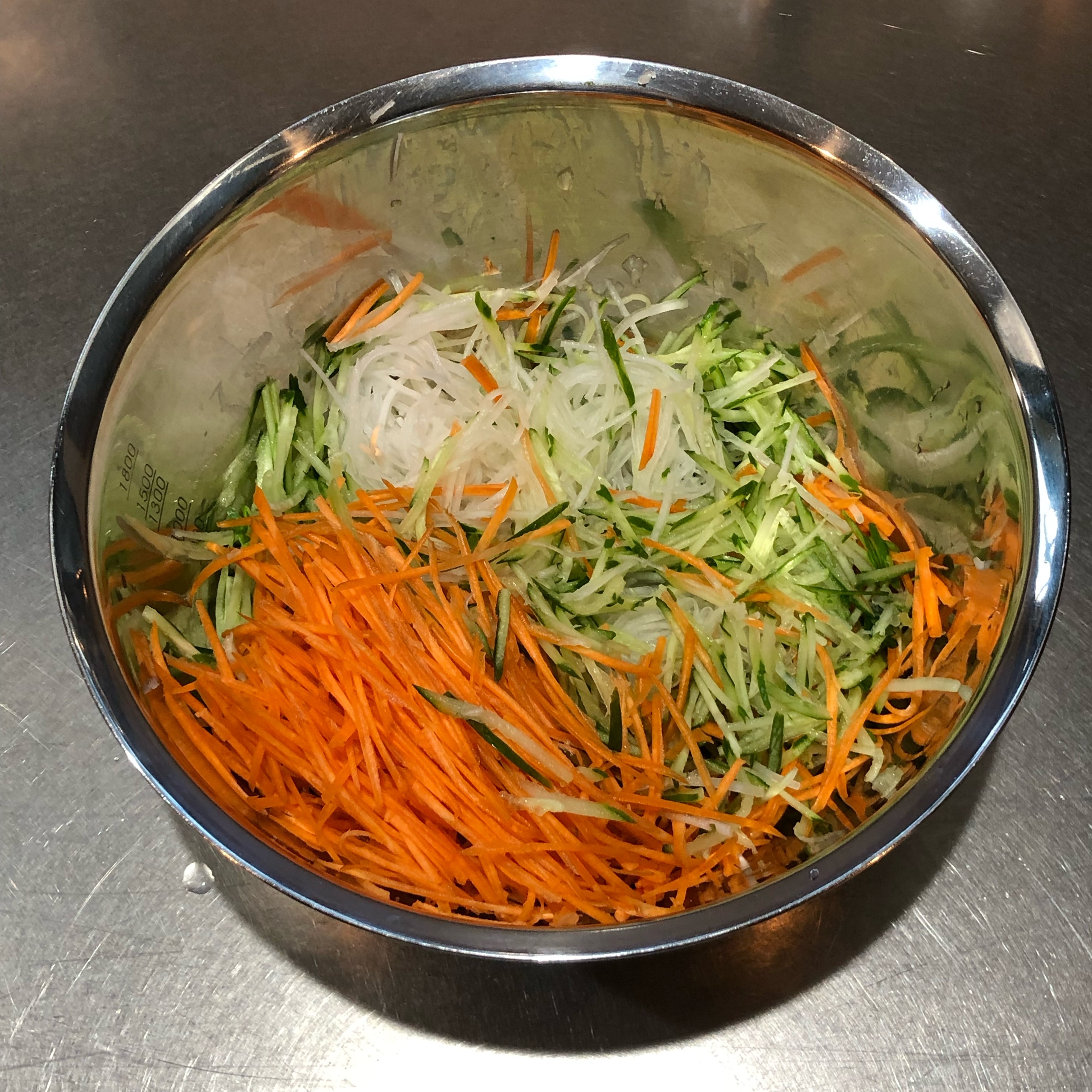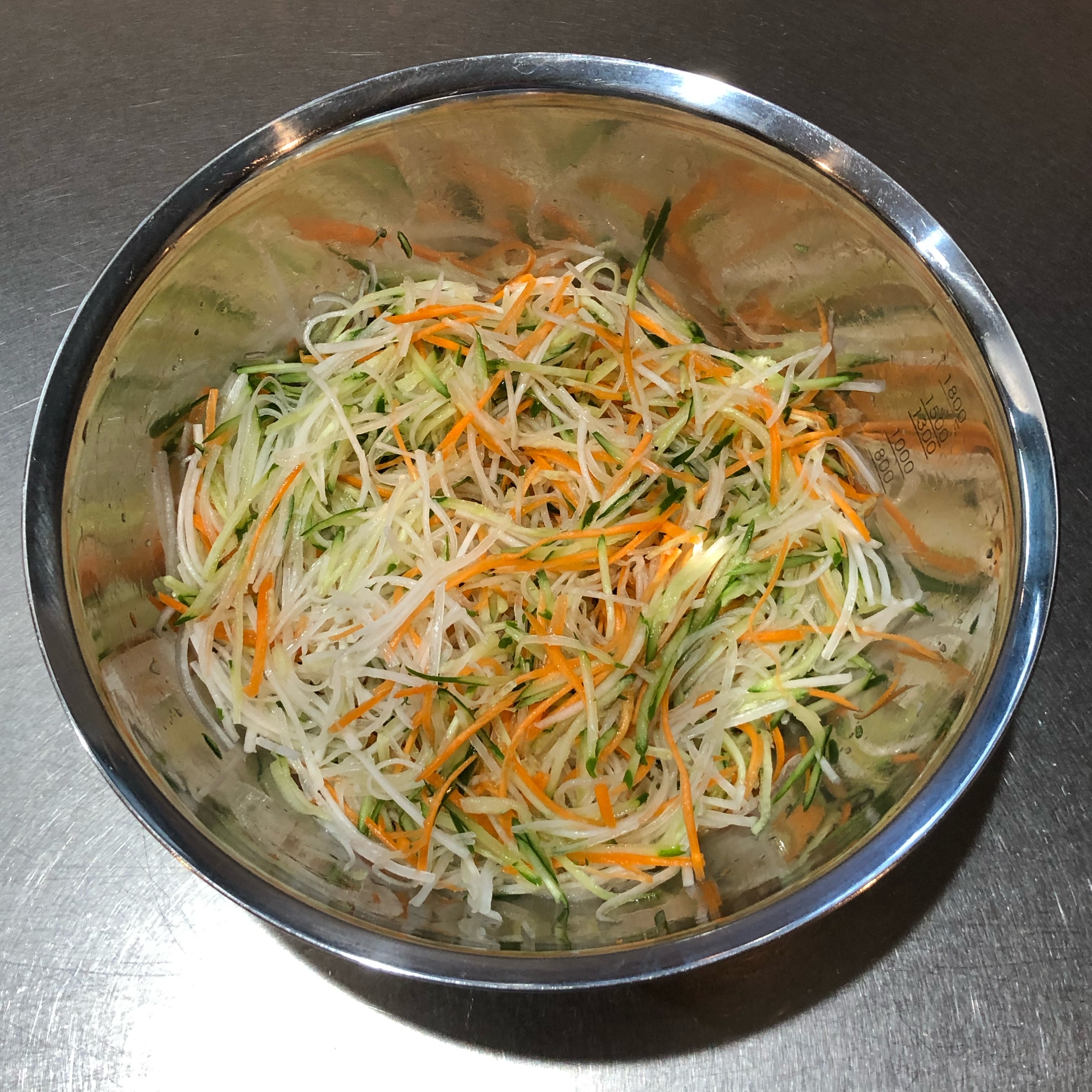 大根、きゅうり、にんじんは、スライサーで千切りにする。