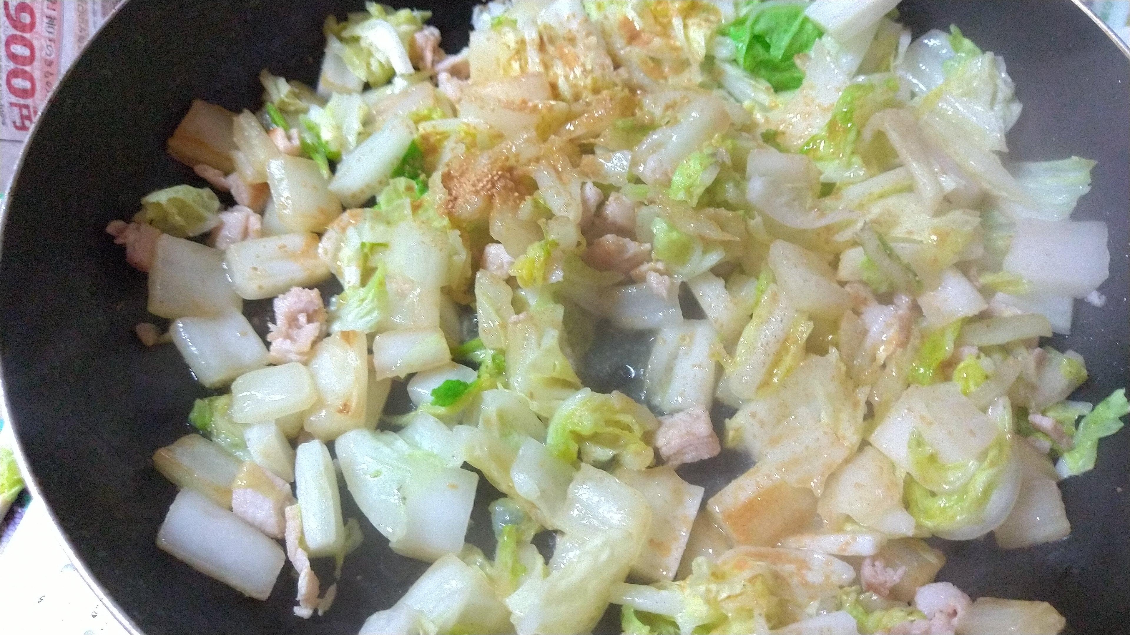ほんだし粉末と塩コショウを入れて混ぜながら炒める