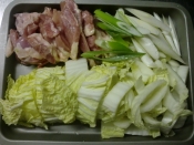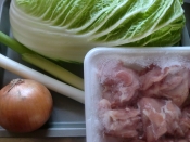 白菜の白い芯の方は1センチくらいに、葉の方は2~3センチくらいに切ります。長ネギは斜めに切ります。鶏肉は1.5センチくらいの厚さに切ります。