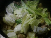 ⑤に白菜の葉の部分とネギの緑の部分を入れ、混ぜ合わせま。、最後に水溶き片栗粉でとろみをつけます。とろみがついたら完成です。